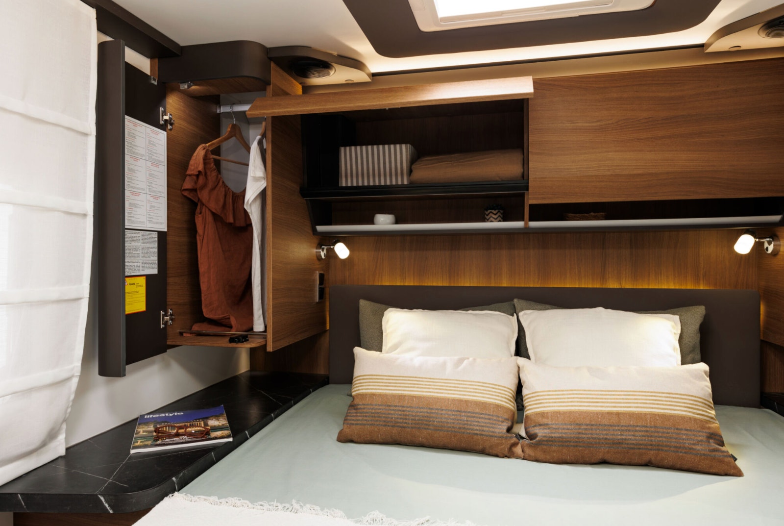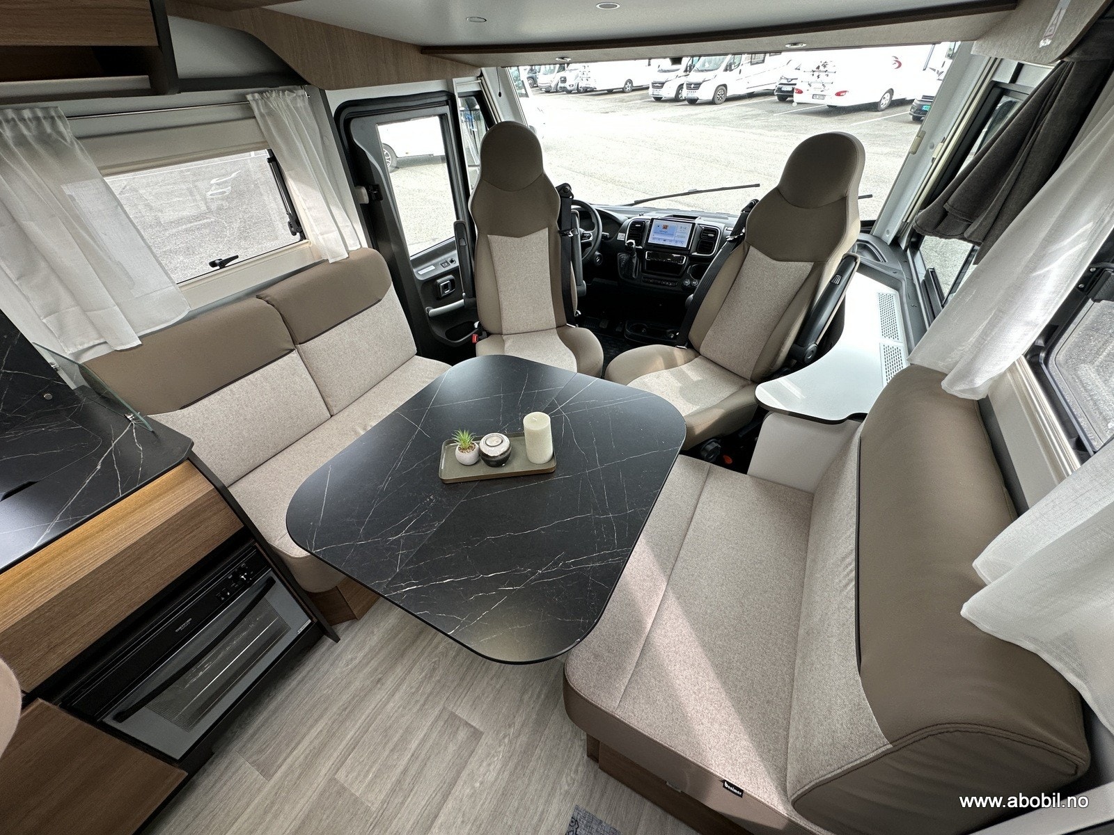 Salongen består av to svingbare pilotstoler og romslig sittegruppe – perfekt for både måltider og avslapping. Store vinduer og panorama takluke gir masse naturlig lys. TV-plass med 12V og 230V strømuttak er klart til bruk. Myggnett og mørkleggingsgardiner er standard på alle åpninger.