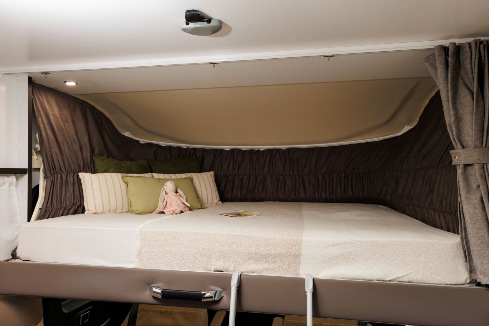 Amphitryon 998 er registrert for 4 personer og har en  komfortable dobbeltseng med 20 cm tykke madrasser. Det finnes garderobeskap og god lagring også under sengen. En elektrisk senkeseng foran gir ytterligere to soveplasser og tåler hele 250 kg. Praktisk skilledør mellom soverom og salong/bad gir ekstra privatliv.