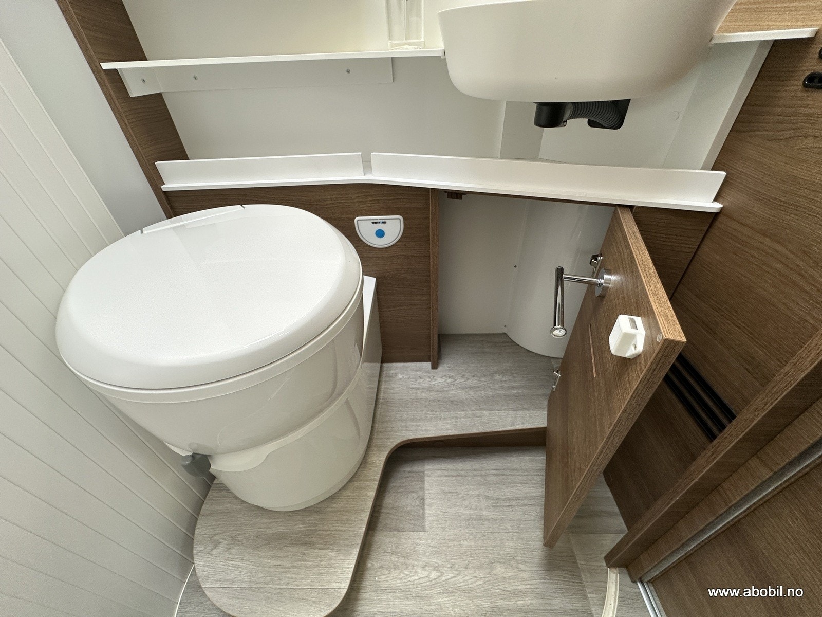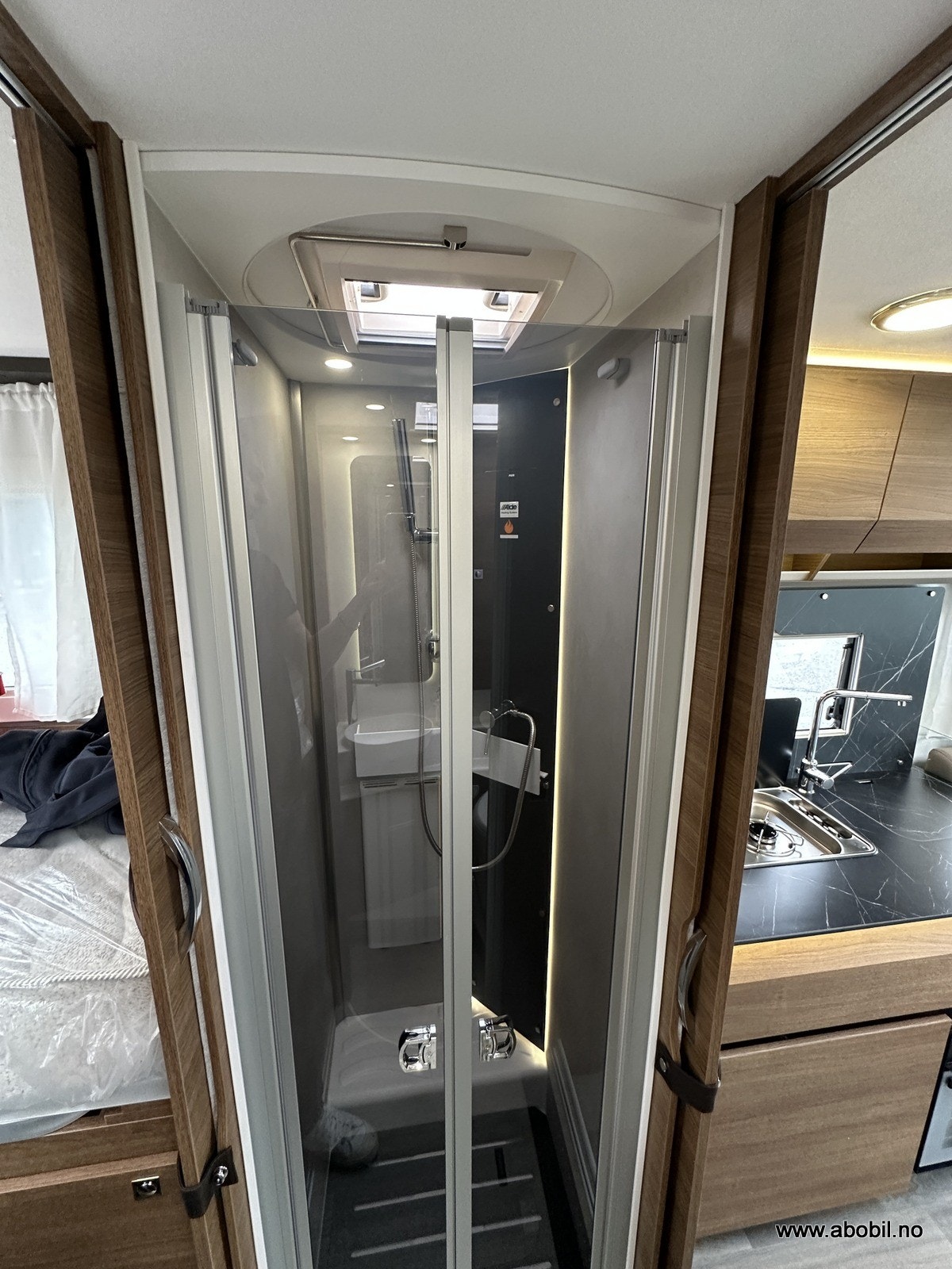 Separat dusj med dør og takluke gir svært god komfort. Dusjen har også nedtrekkbar stang for tørking av klær eller håndklær. Godt vanntrykk, og det er rikelig med skapplass, stort speil og svingbart toalett. Takluken har myggnett og formørkningsgardin – som resten av bodelens åpninger.