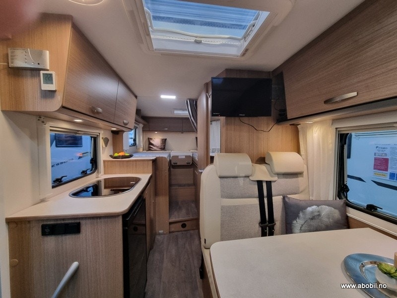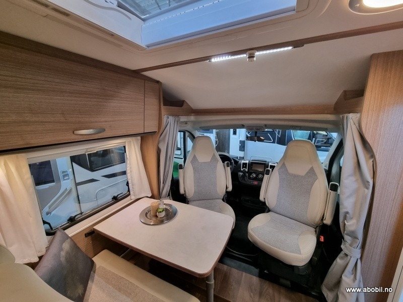Praktisk planløsning med separat dusj og toalettrom, innholdsrikt kjøkken med god skapplass, 3 kokebluss og stort kjøleskap. I denne bobilen får du også en romslig sittegruppe med svingbare forseter.