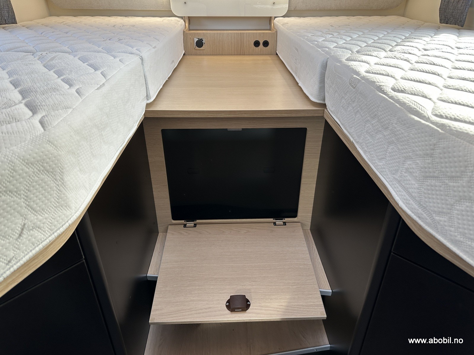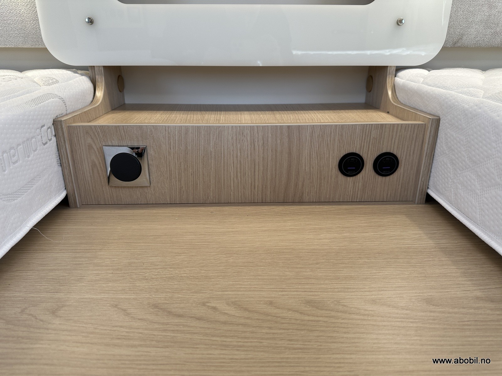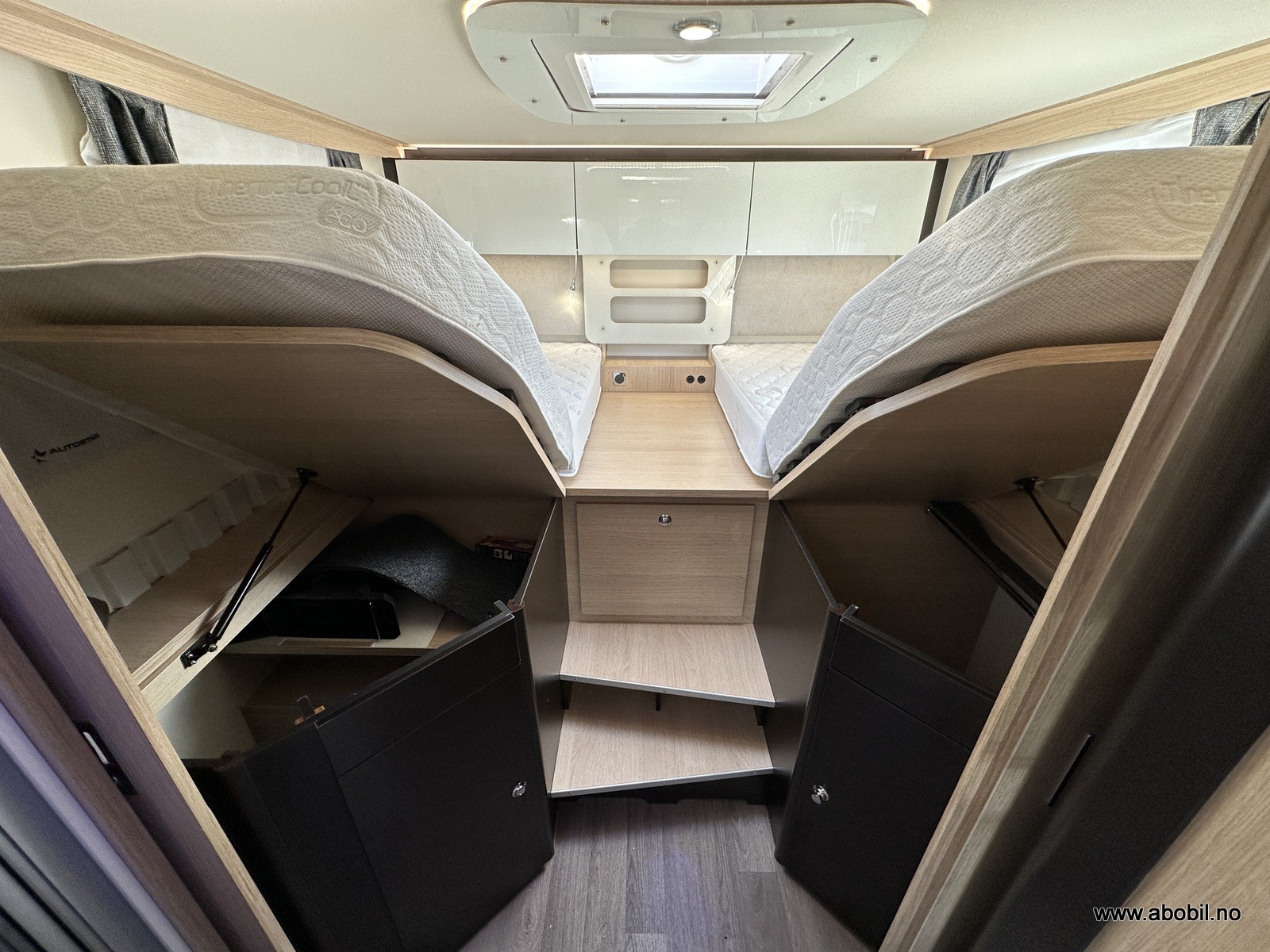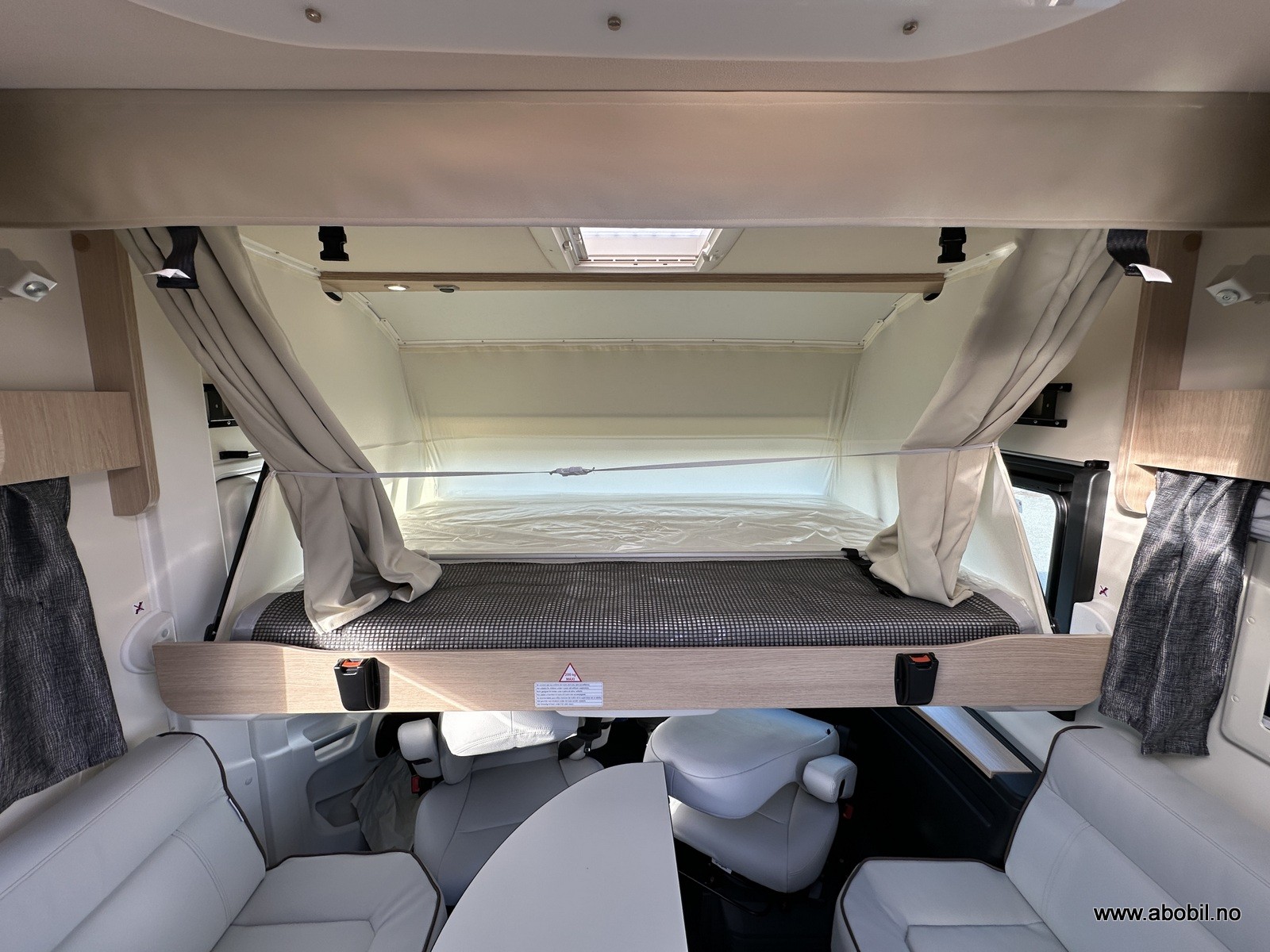 Styring av varmen skjer selvsagt fra soverommet. På soverommet finner du flere ladepunkt og et radioanlegg med Bluetooth. Da kan du spille av hva du måtte ønsker direkte fra din smarttelefon. For ekstra soveplass er det senkeseng i taket i førerhuset (140*190cm)