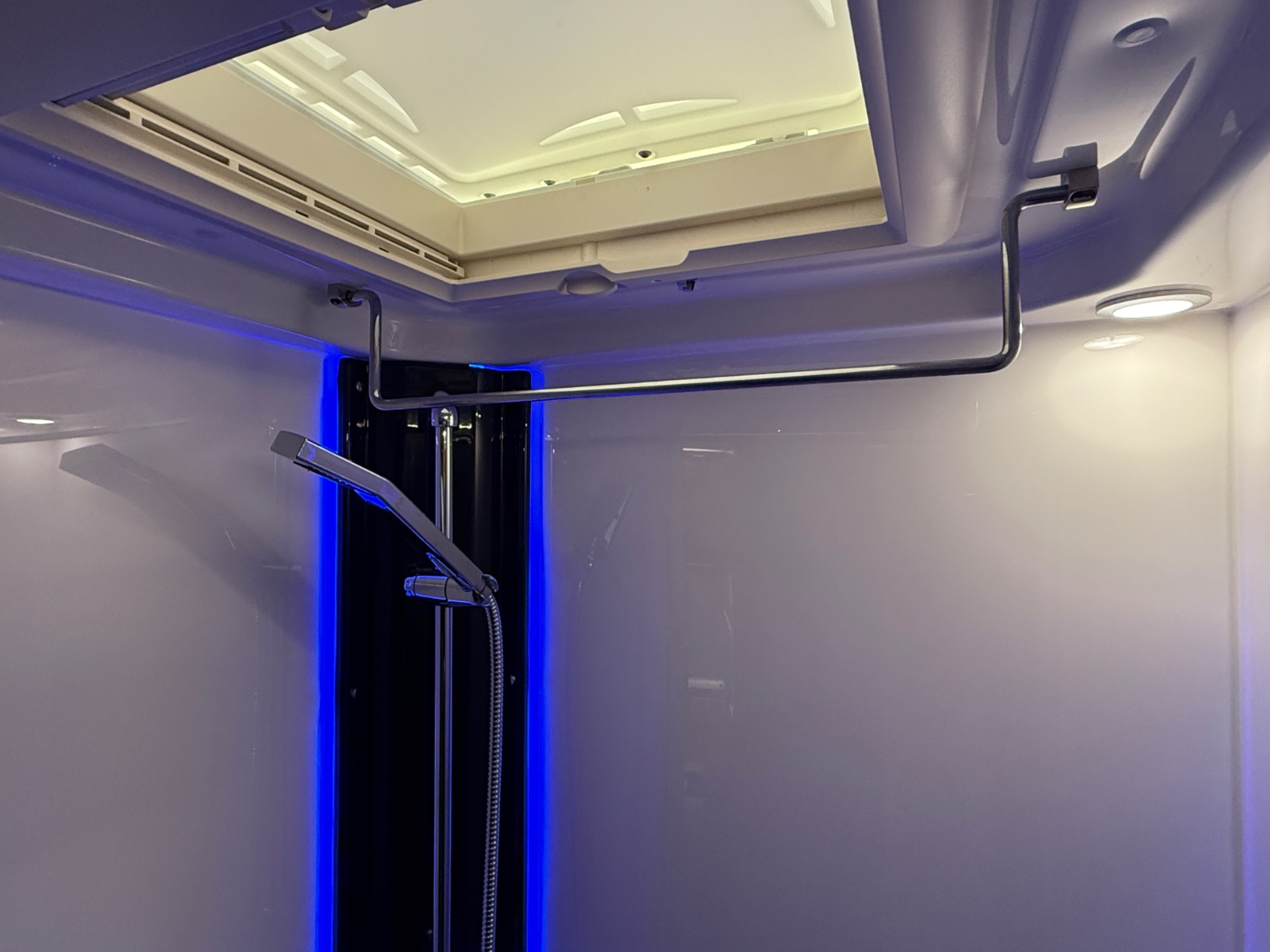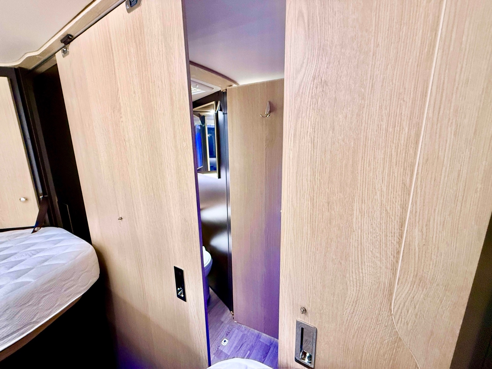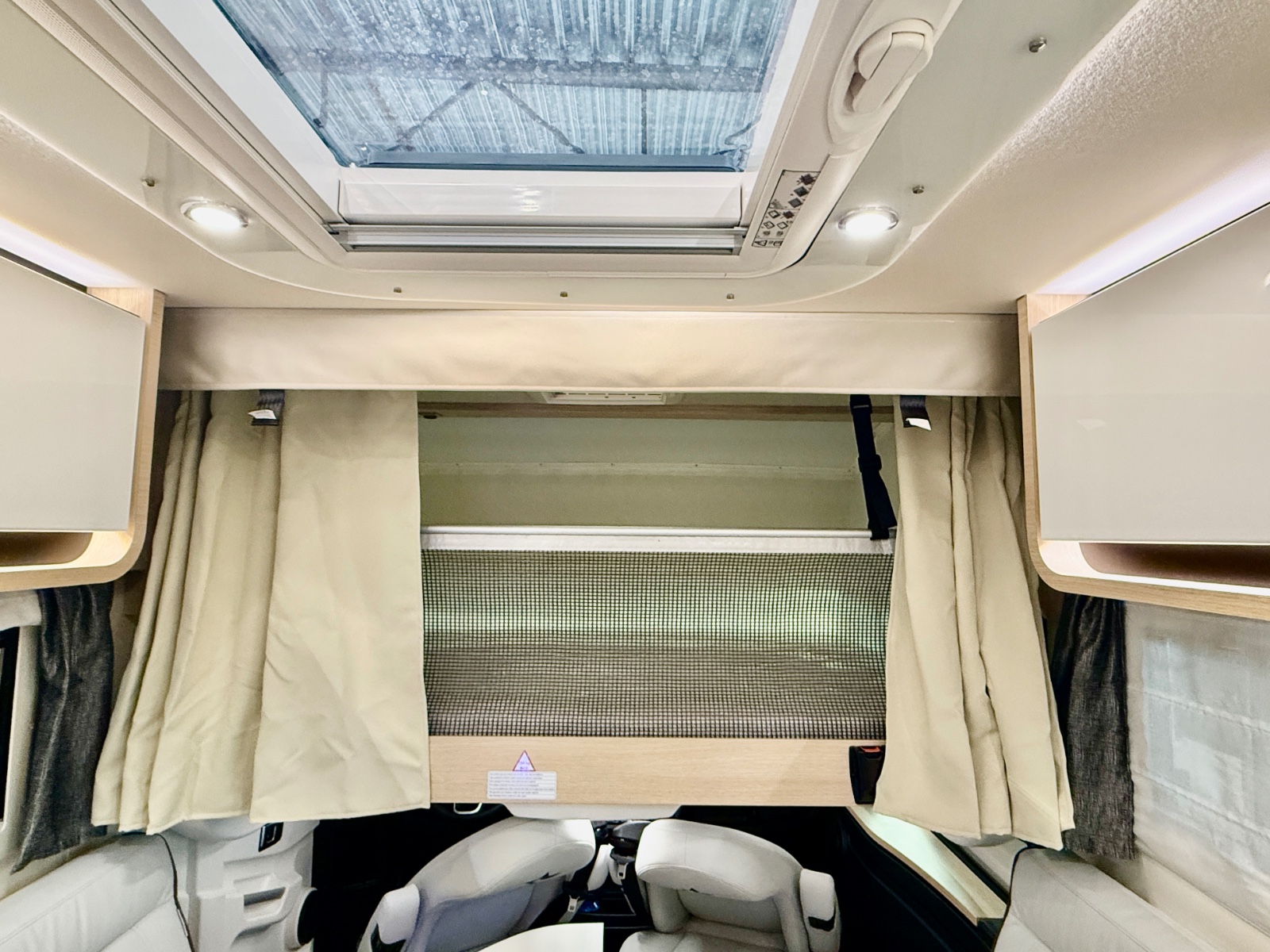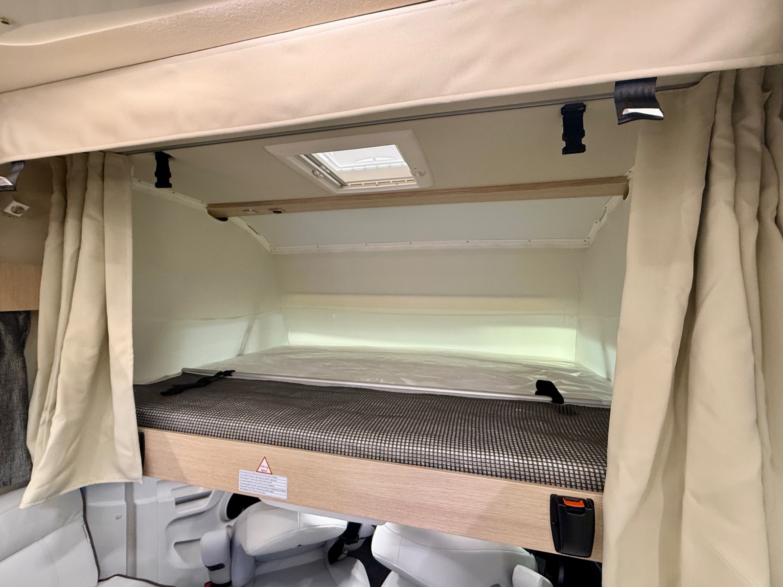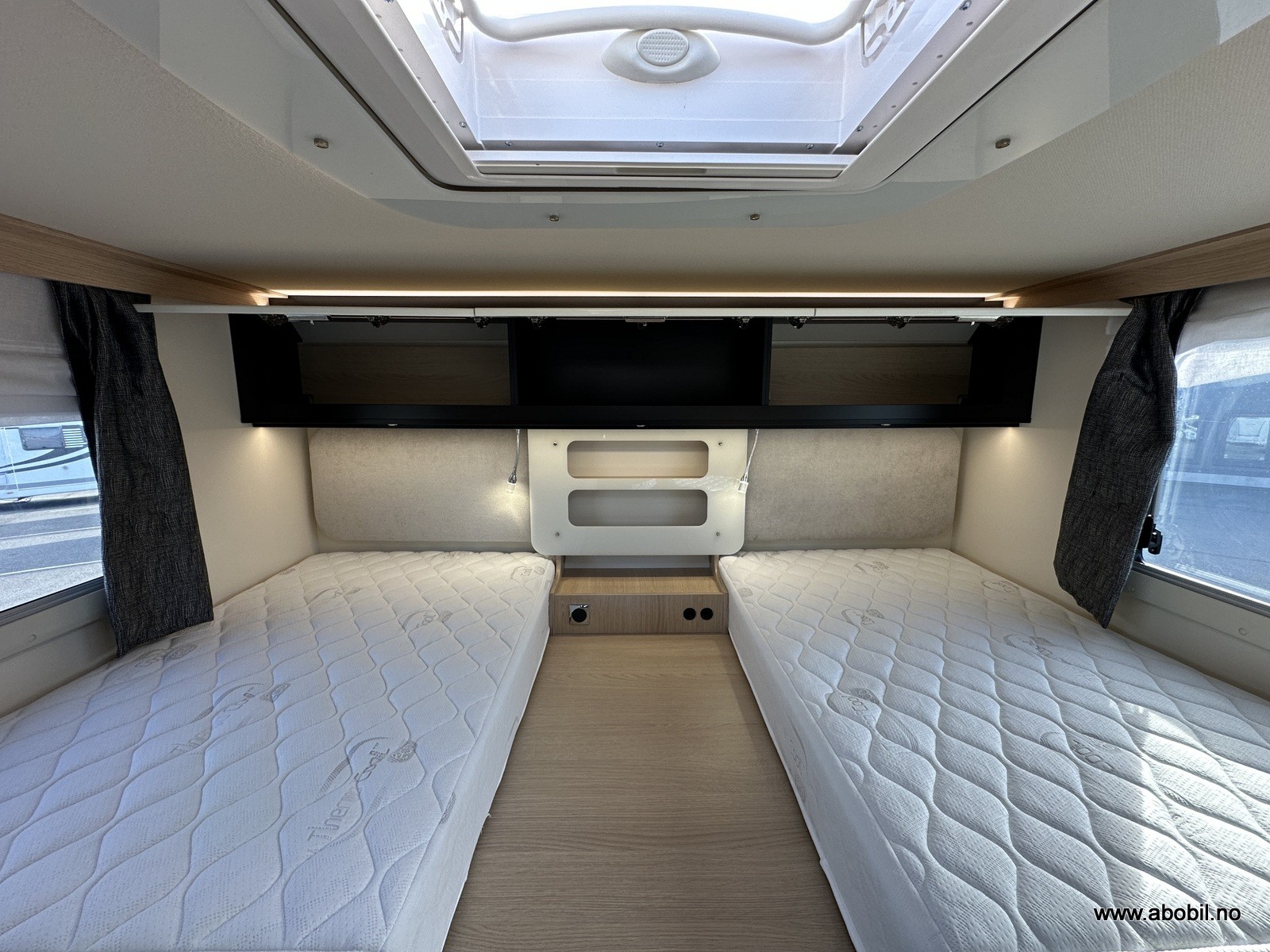 Styring av varmen skjer selvsagt fra soverommet. På soverommet finner du flere ladepunkt og et radioanlegg med Bluetooth. Da kan du spille av hva du måtte ønsker direkte fra din smarttelefon. For ekstra soveplass er det senkeseng i taket i førerhuset (140*190cm)