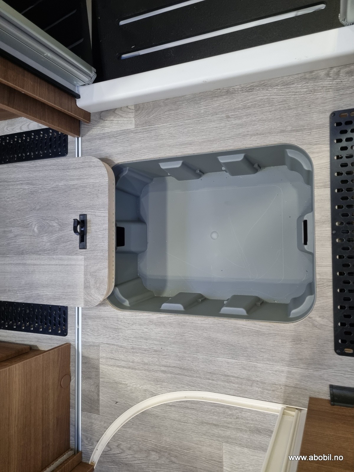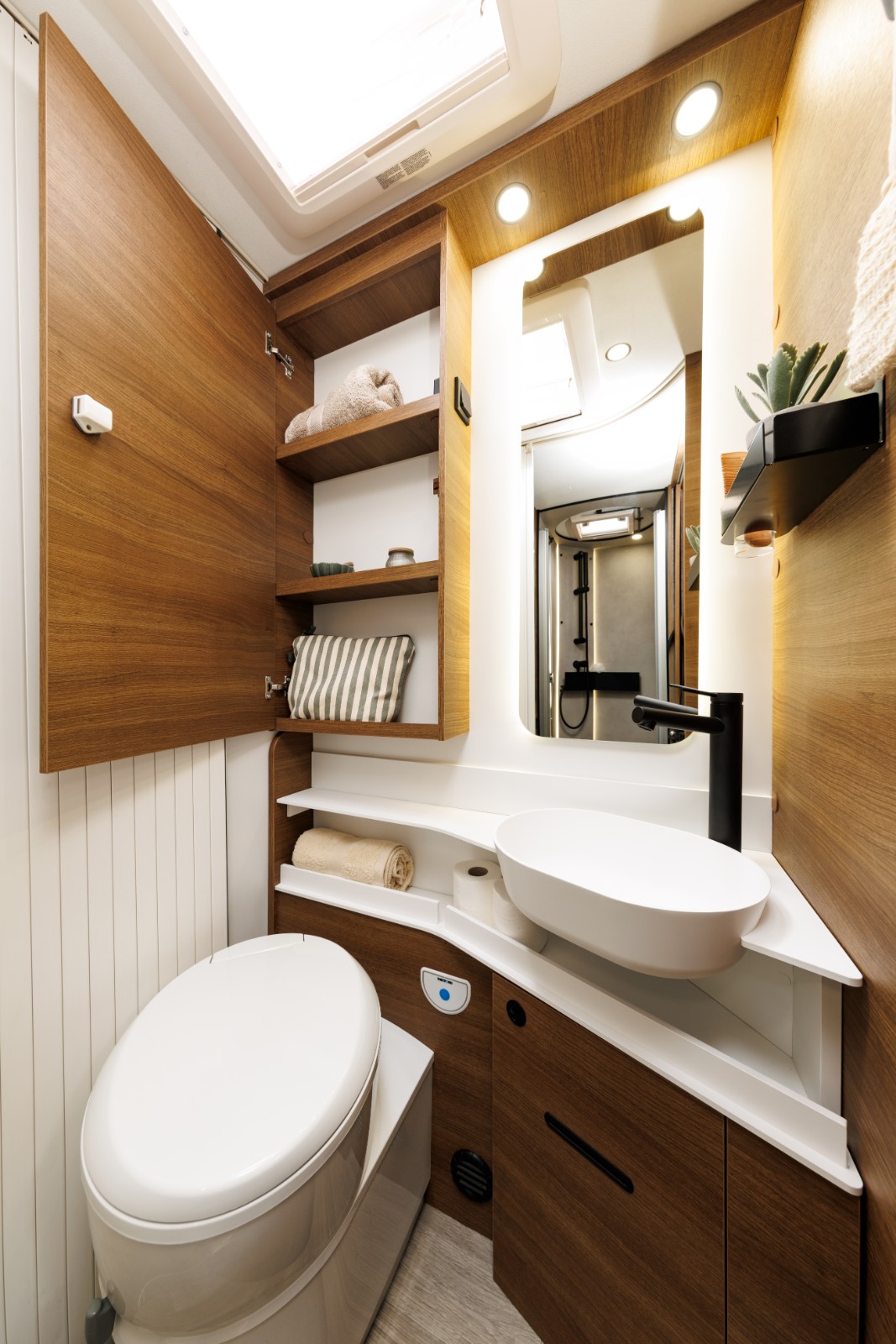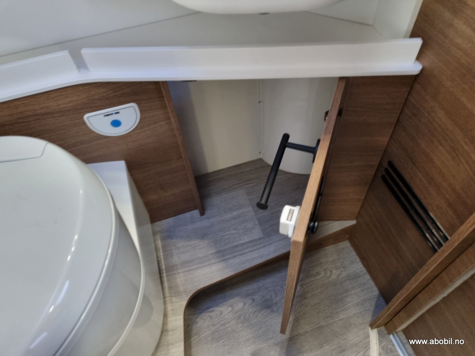 Separat dusj med dør og takluke gir svært god komfort. Dusjen har også nedtrekkbar stang for tørking av klær eller håndklær. Godt vanntrykk, og det er rikelig med skapplass, stort speil og svingbart toalett. Takluken har myggnett og formørkningsgardin – som resten av bodelens åpninger.