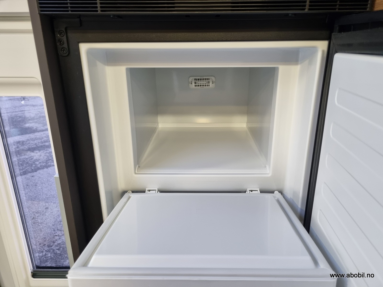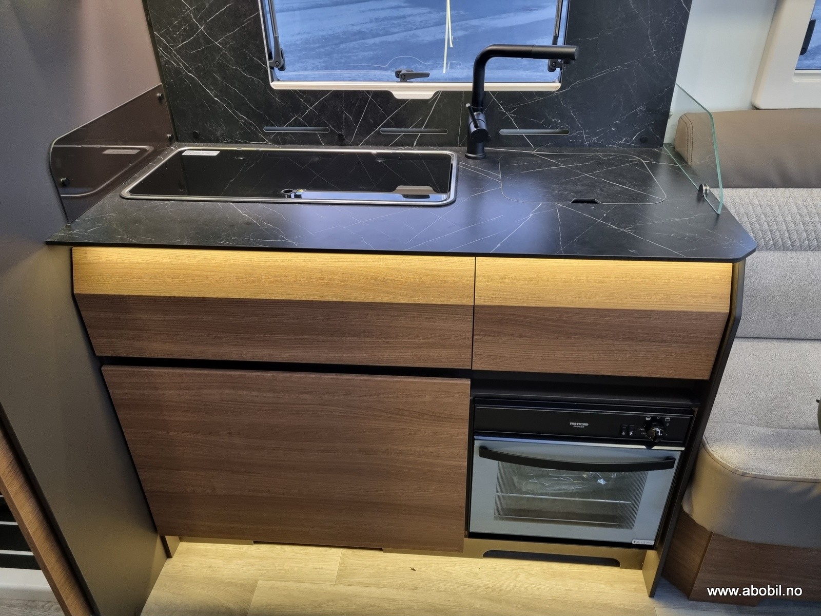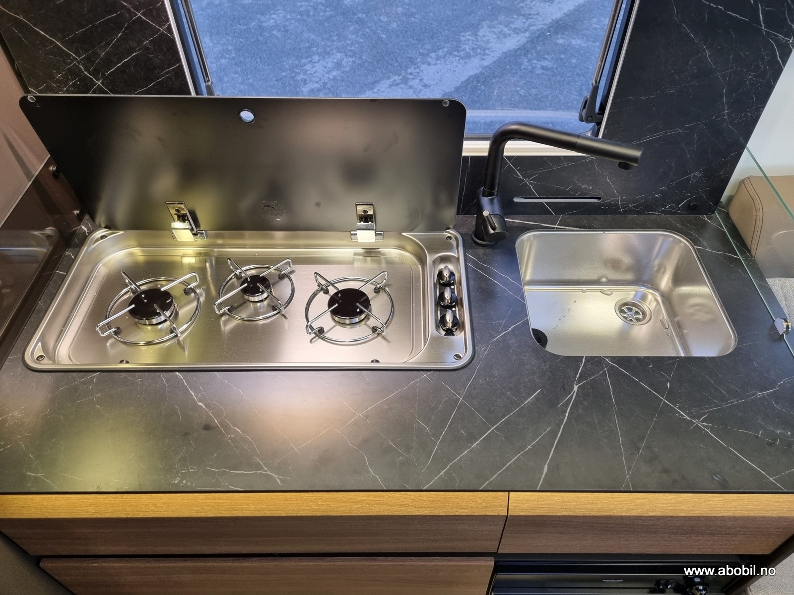 Praktisk og moderne kjøkken med tre gassbluss, elektrisk tenning og todelt glassdeksel som både beskytter og utvider benkeplassen. Stekeovn og kjøkkenvifte sørger for gode matlagingsmuligheter. Romslig vask og store skuffer gir god oppbevaringsplass. Stort automatisk kjøleskap med separat frysedel gjør det enkelt å ta med nok mat på tur. Takluke med myggnett og plissÃgardin over kjøkkenet gir god ventilasjon.