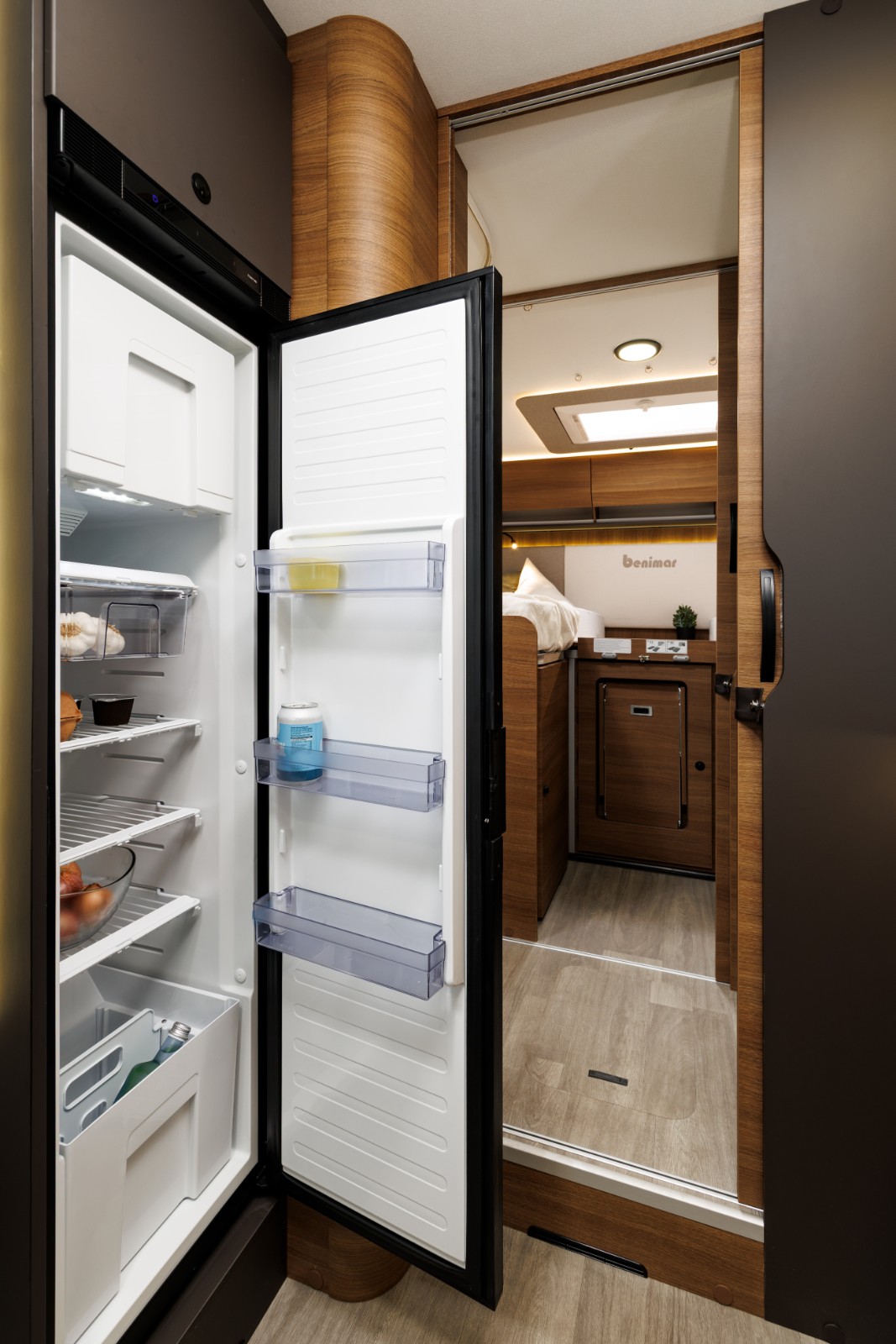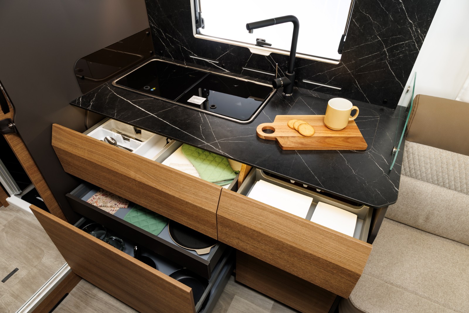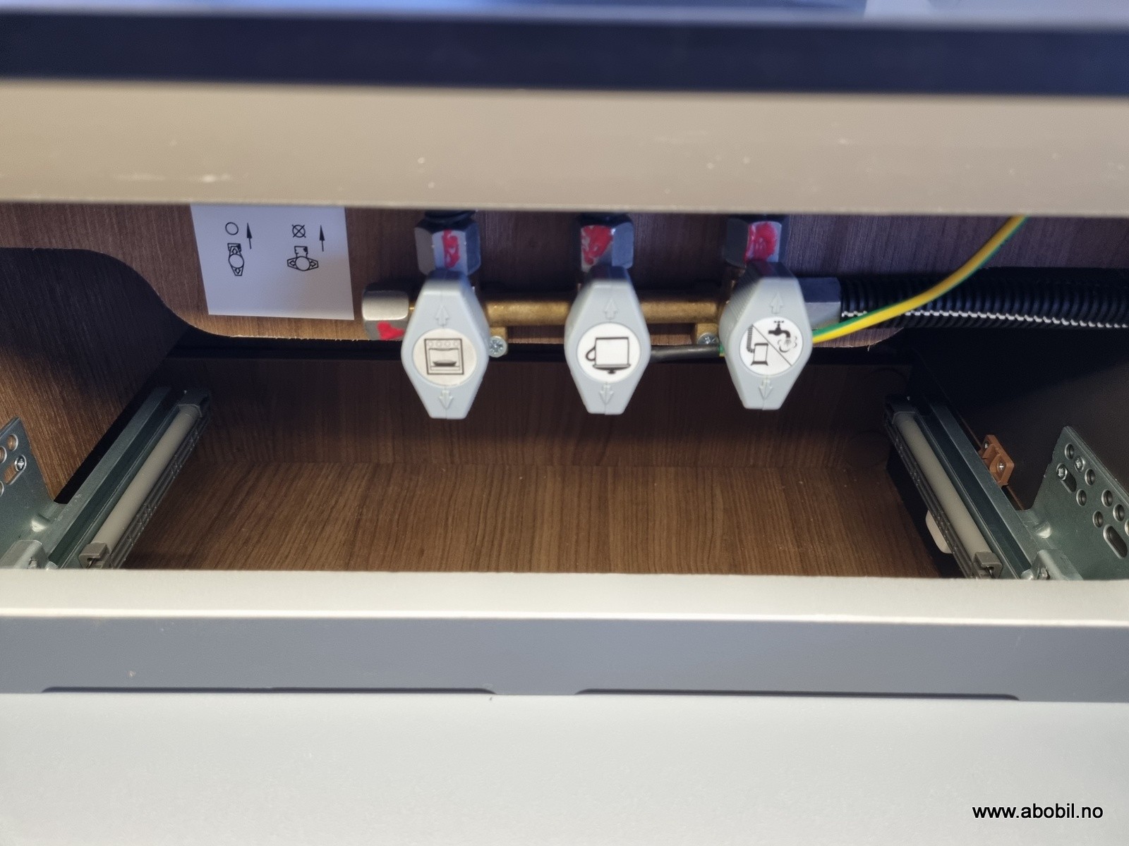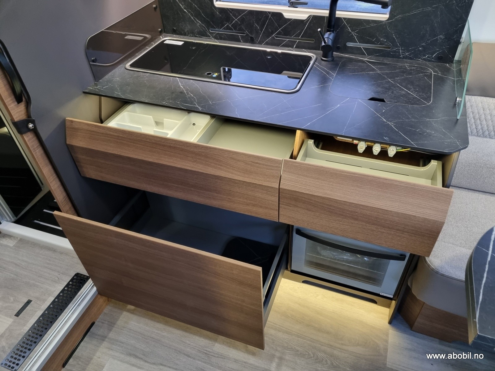 Praktisk og moderne kjøkken med tre gassbluss, elektrisk tenning og todelt glassdeksel som både beskytter og utvider benkeplassen. Stekeovn og kjøkkenvifte sørger for gode matlagingsmuligheter. Romslig vask og store skuffer gir god oppbevaringsplass. Stort automatisk kjøleskap med separat frysedel gjør det enkelt å ta med nok mat på tur. Takluke med myggnett og plissÃgardin over kjøkkenet gir god ventilasjon.