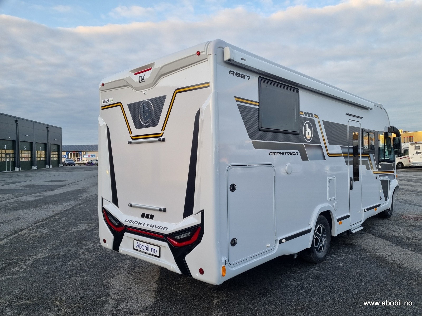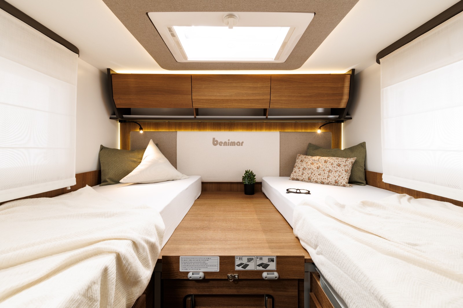 Amphitryon 967 er registrert for 4 personer og har to komfortable enkeltsenger bak med 20 cm tykke madrasser – kan gjøres om til stor dobbeltseng. Det finnes garderobeskap og god lagring også under sengene. En elektrisk senkeseng foran gir ytterligere to soveplasser og tåler hele 250 kg. Praktisk skilledør mellom soverom og salong/bad gir ekstra privatliv.