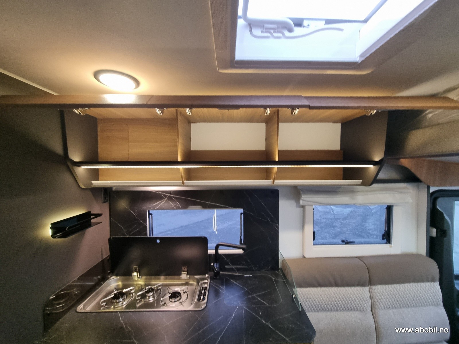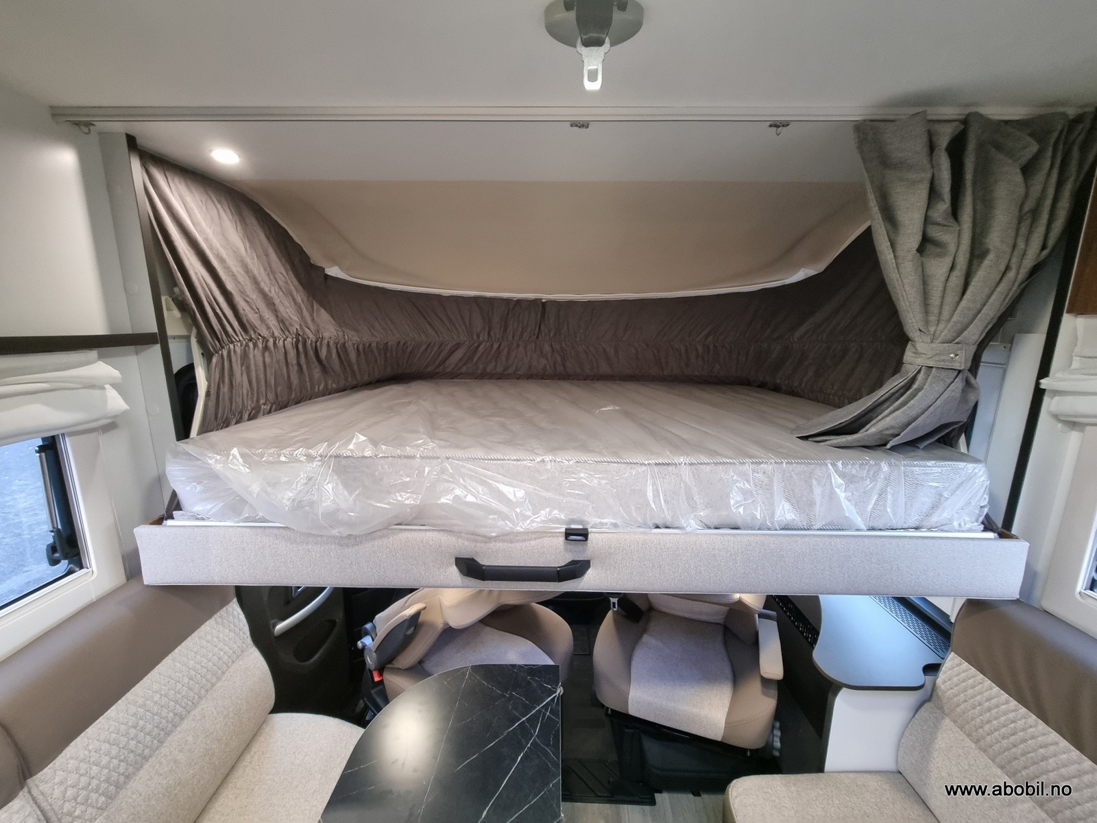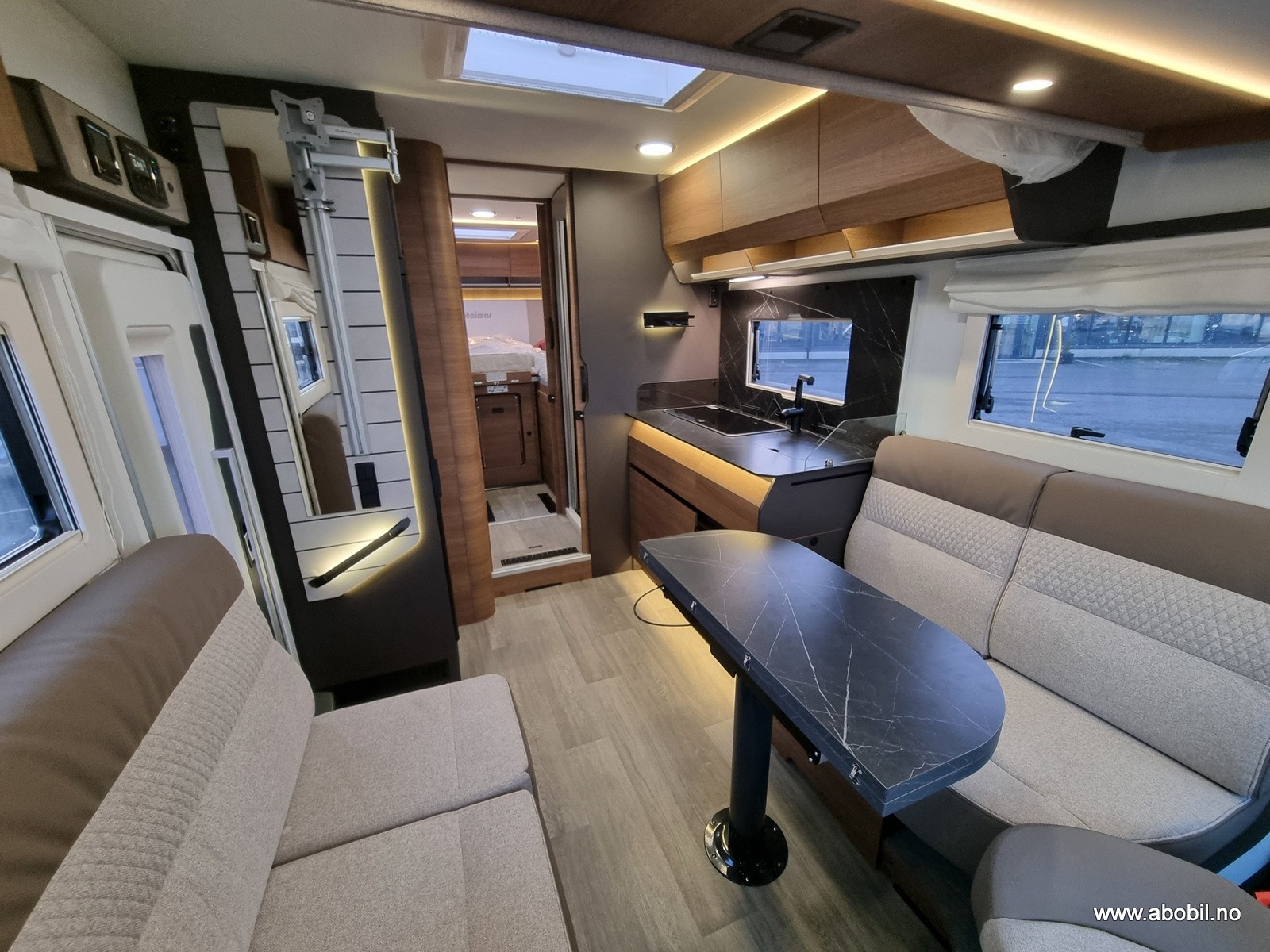 Salongen består av to svingbare pilotstoler og romslig sittegruppe – perfekt for både måltider og avslapping. Store vinduer og panorama takluke gir masse naturlig lys. TV-plass med 12V og 230V strømuttak er klart til bruk. Myggnett og mørkleggingsgardiner er standard på alle åpninger.