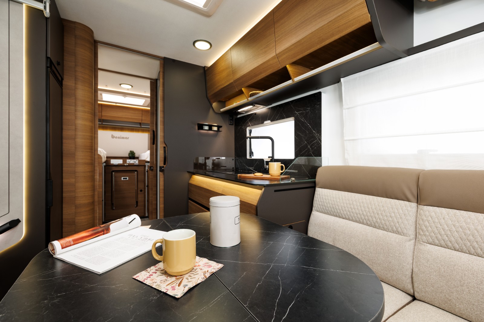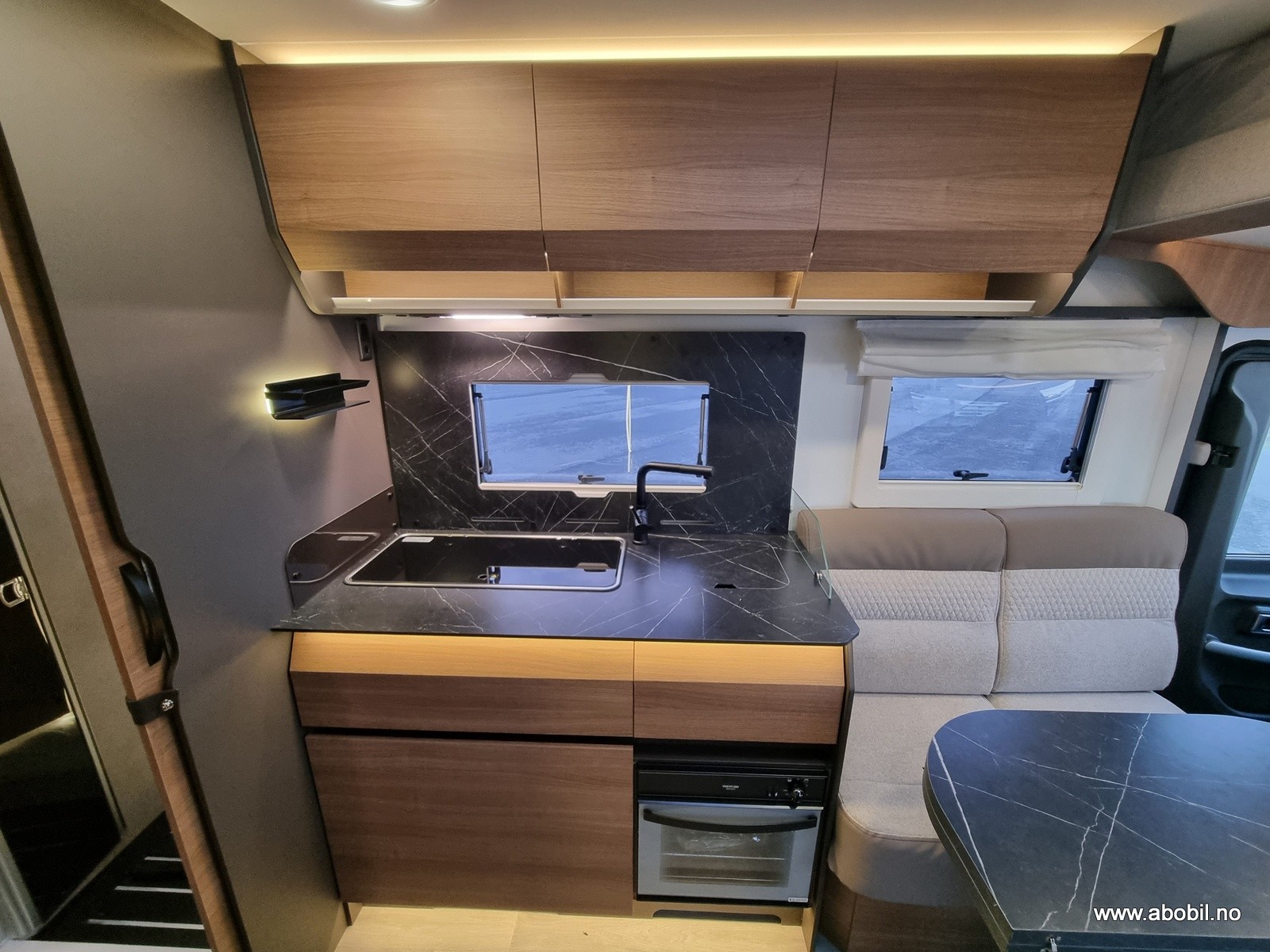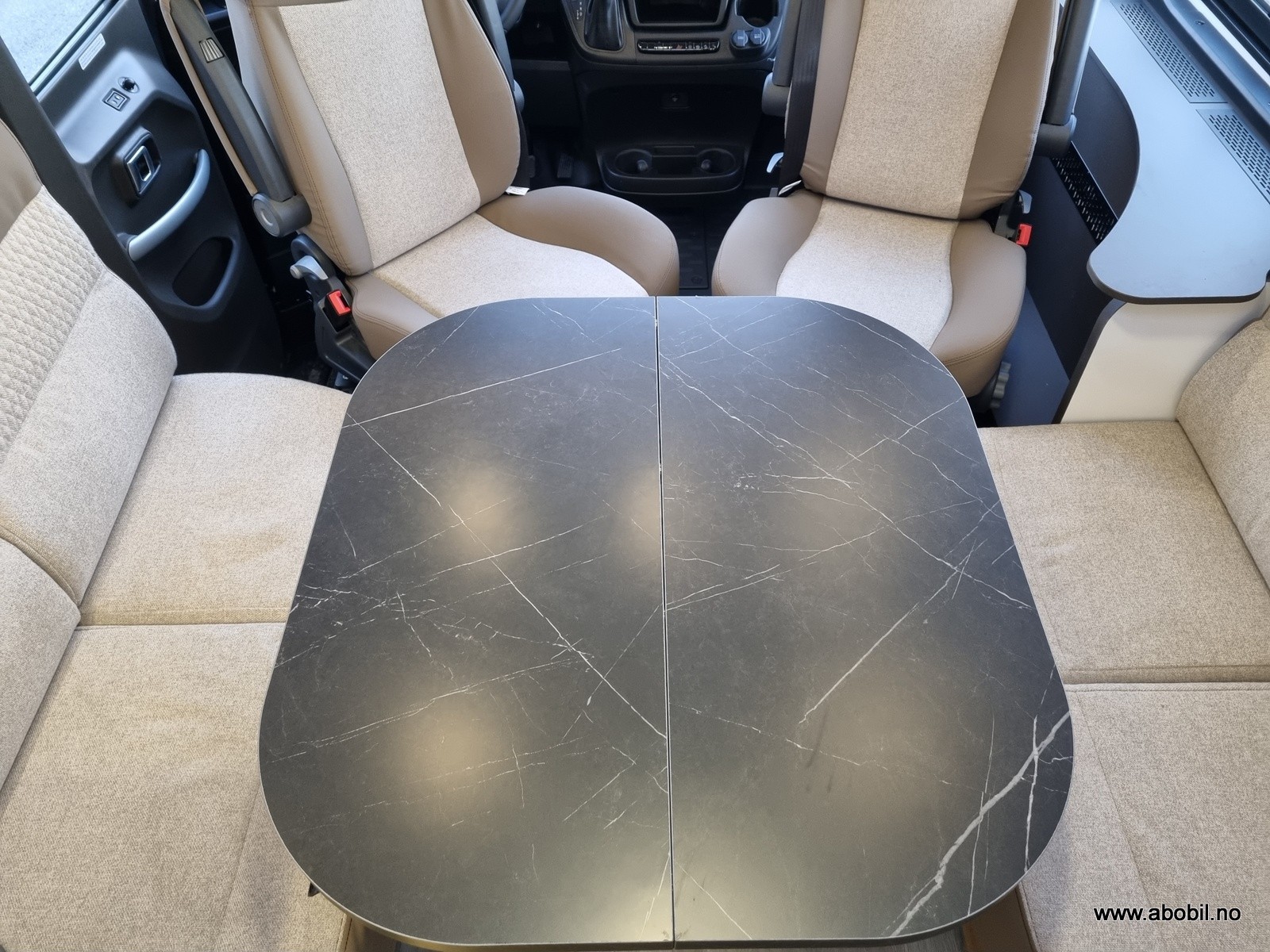 Salongen består av to svingbare pilotstoler og romslig sittegruppe – perfekt for både måltider og avslapping. Store vinduer og panorama takluke gir masse naturlig lys. TV-plass med 12V og 230V strømuttak er klart til bruk. Myggnett og mørkleggingsgardiner er standard på alle åpninger.