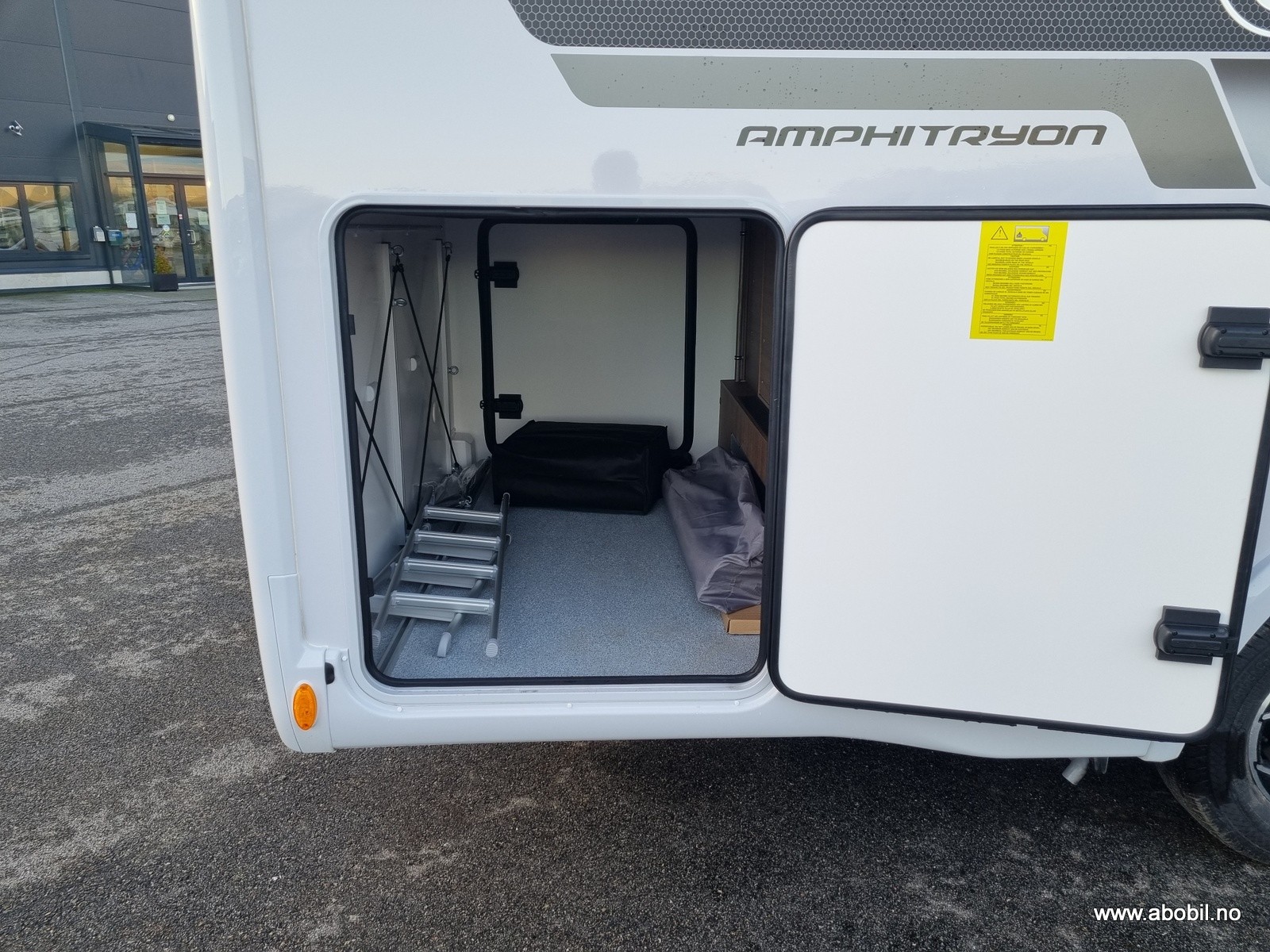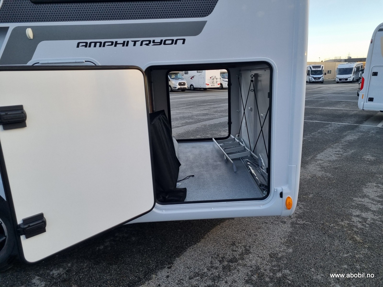Benimar Amphitryon 967 har en stor garasje med tilgang fra begge sider. Den er utstyrt med lys, varme og solide surrefester – perfekt for sykler, grill, bord og turutstyr. Elektrisk stigtrinn for enkel inn-/utstigning og isolert innsteg sørger for komfort året rundt.