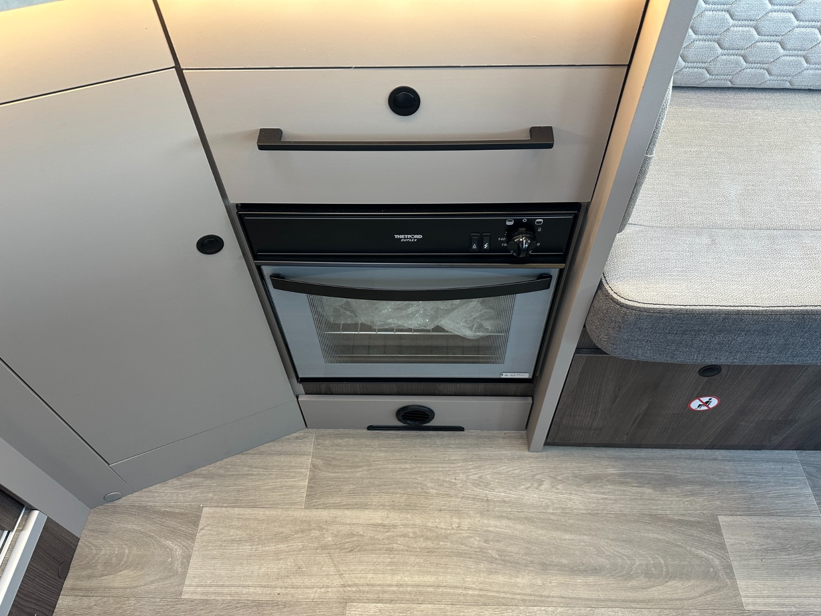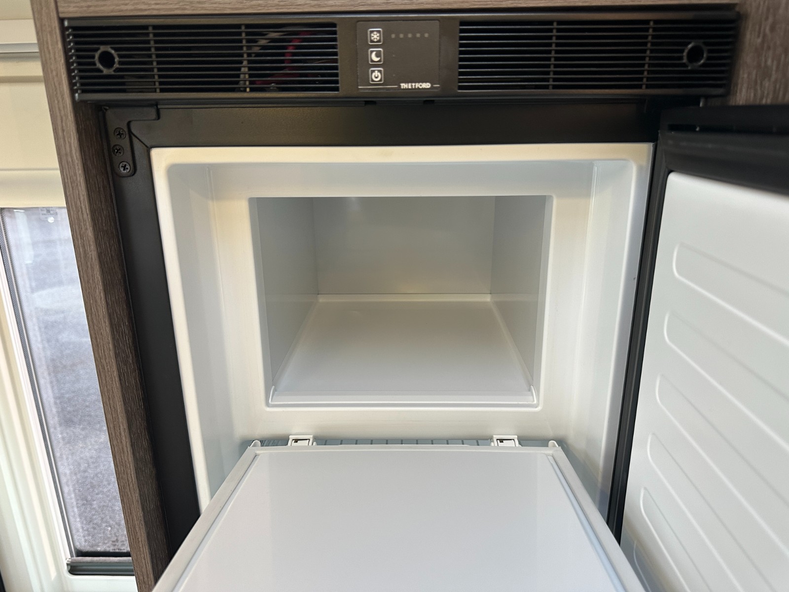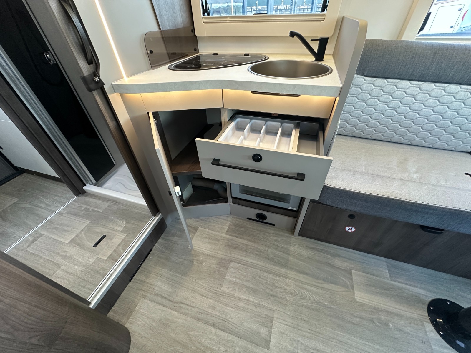 Det inkluderer også et stort kjøleskap med fryser (totalt 150l) og rikelig med lagringsplass for både matvarer og kjøkkenutstyr,