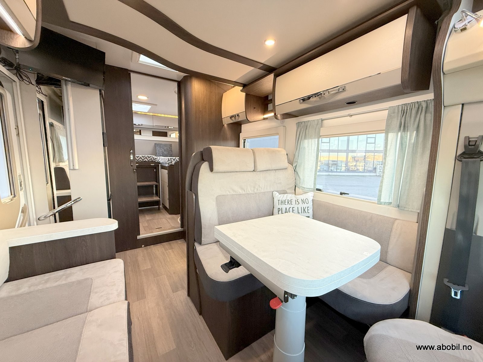 Stor og innbydende L-sofa med matchende "Berlin"-interiør og dreibare pilotstoler gir plass til hele reisefølget.