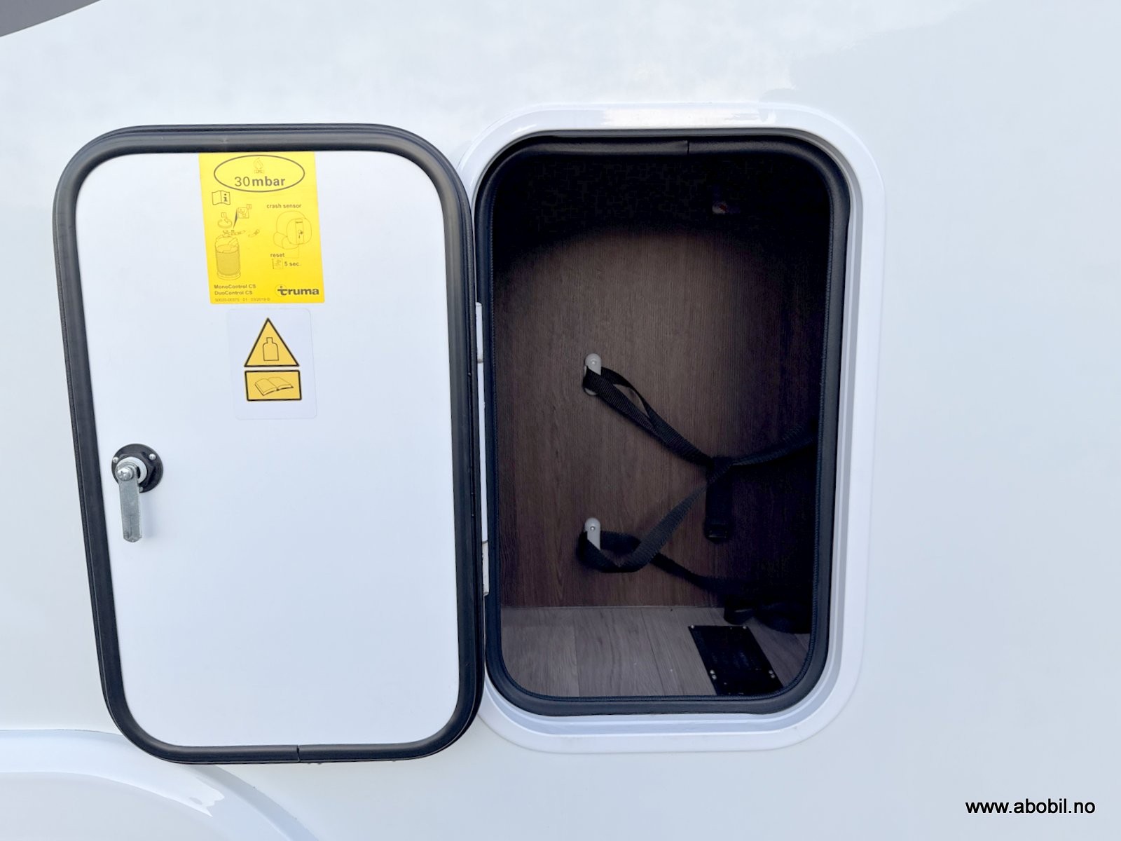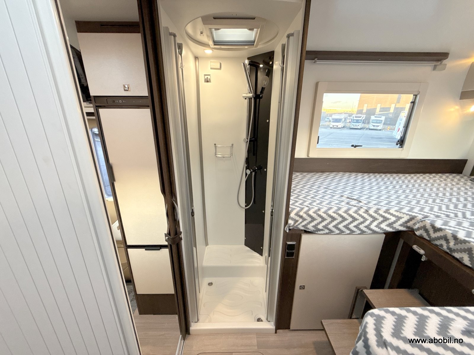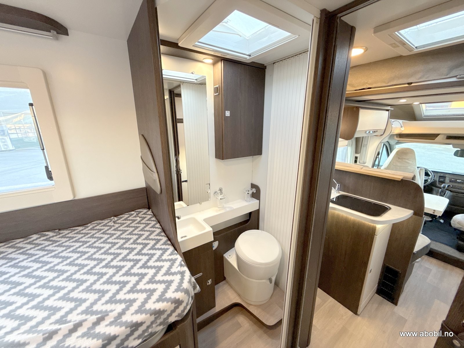 Her får du separat dusjkabinett med dør, eget toalettrom med Thetford svingbart WC, speil, skapplass og god belysning.