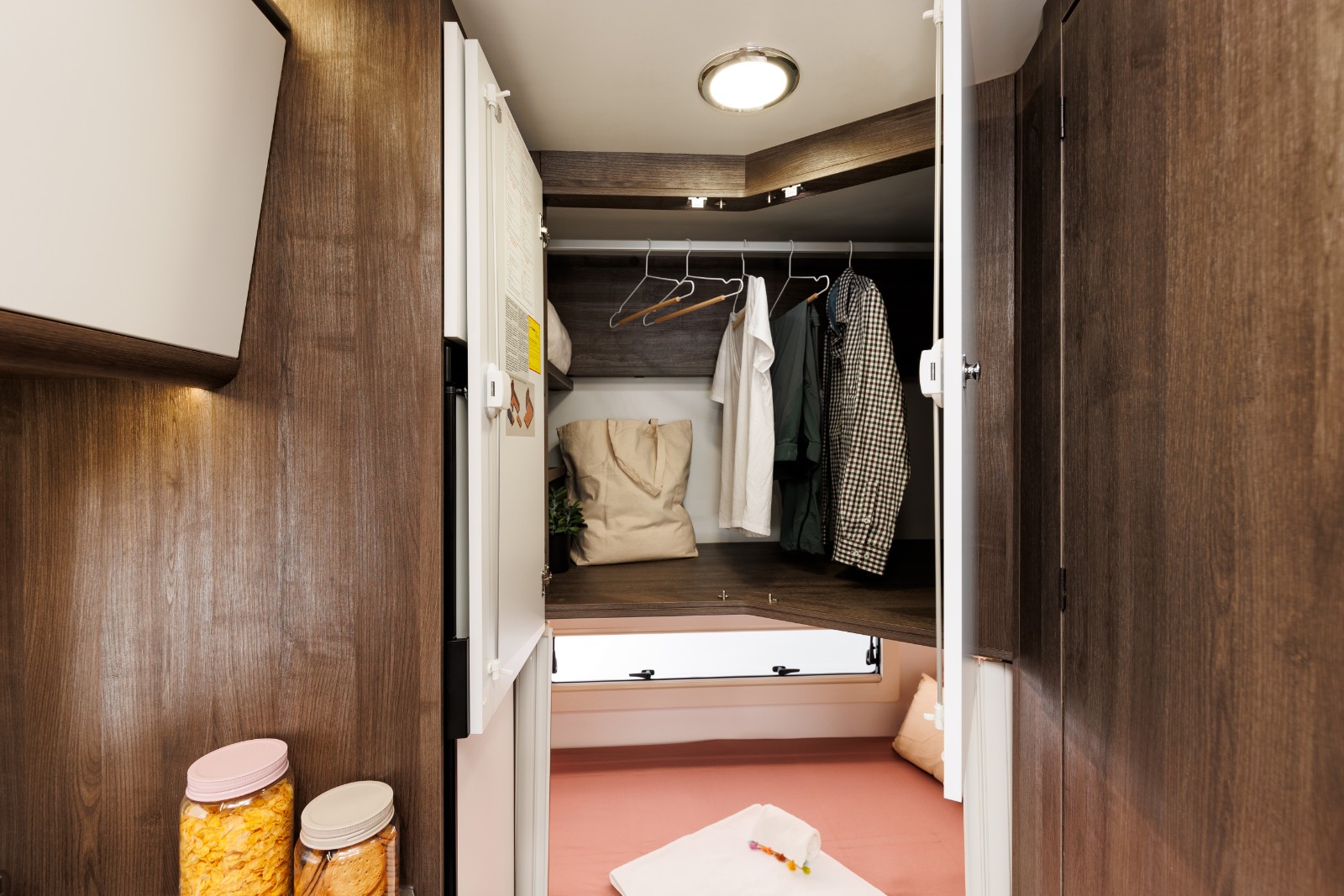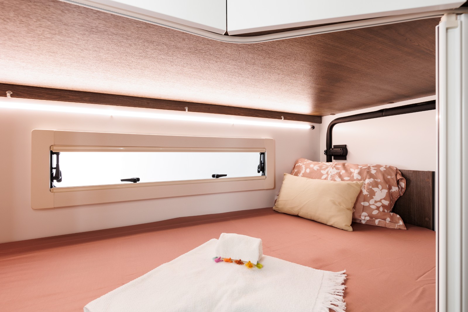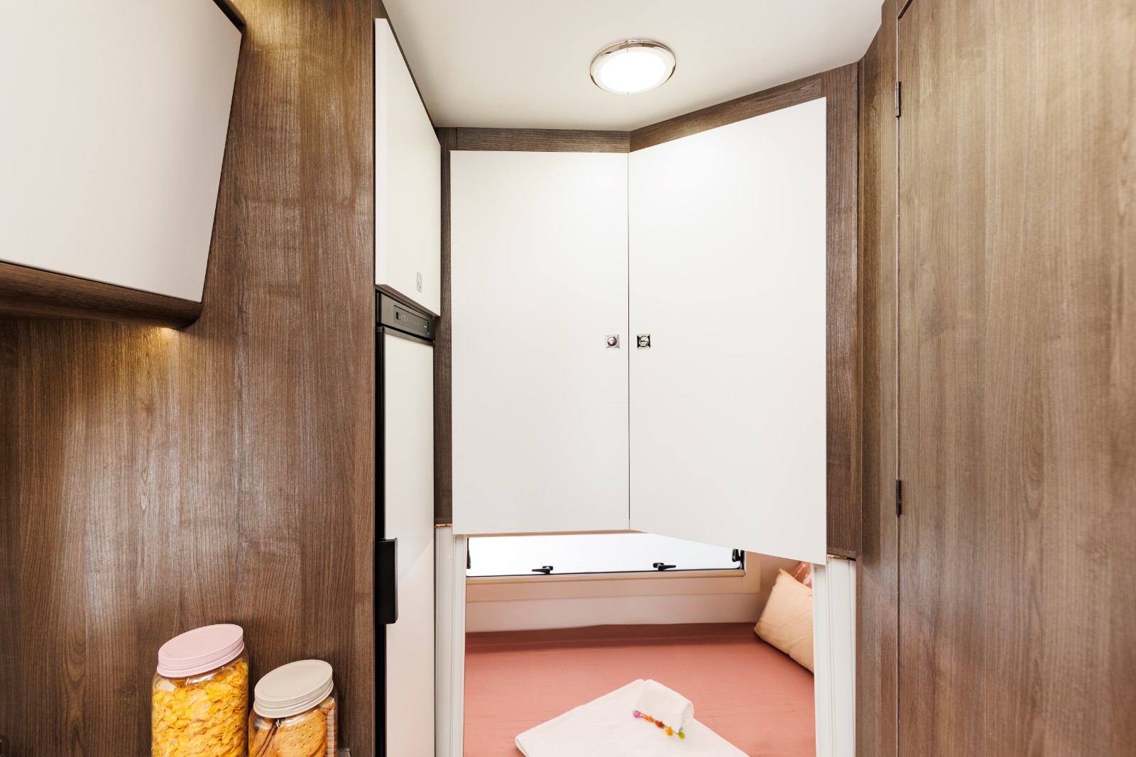 Med senkeseng i taket som hovedseng får denne bobilen en meget stor og romslig salong, perfekt for sosialt samvær og avslapning. I tillegg finnes det en enkeltseng bak med store skap over, som gir ekstra lagringsplass for klær og utstyr. Sengen kan også tas vekk dersom du ønsker mer garasjeplass, noe som gir ekstra fleksibilitet for transport av større gjenstander. Sittegruppen kan også gjøres om til soveplass og gir en seng på str 140*210. Totalt har denne bobilen 5 soveplasser.