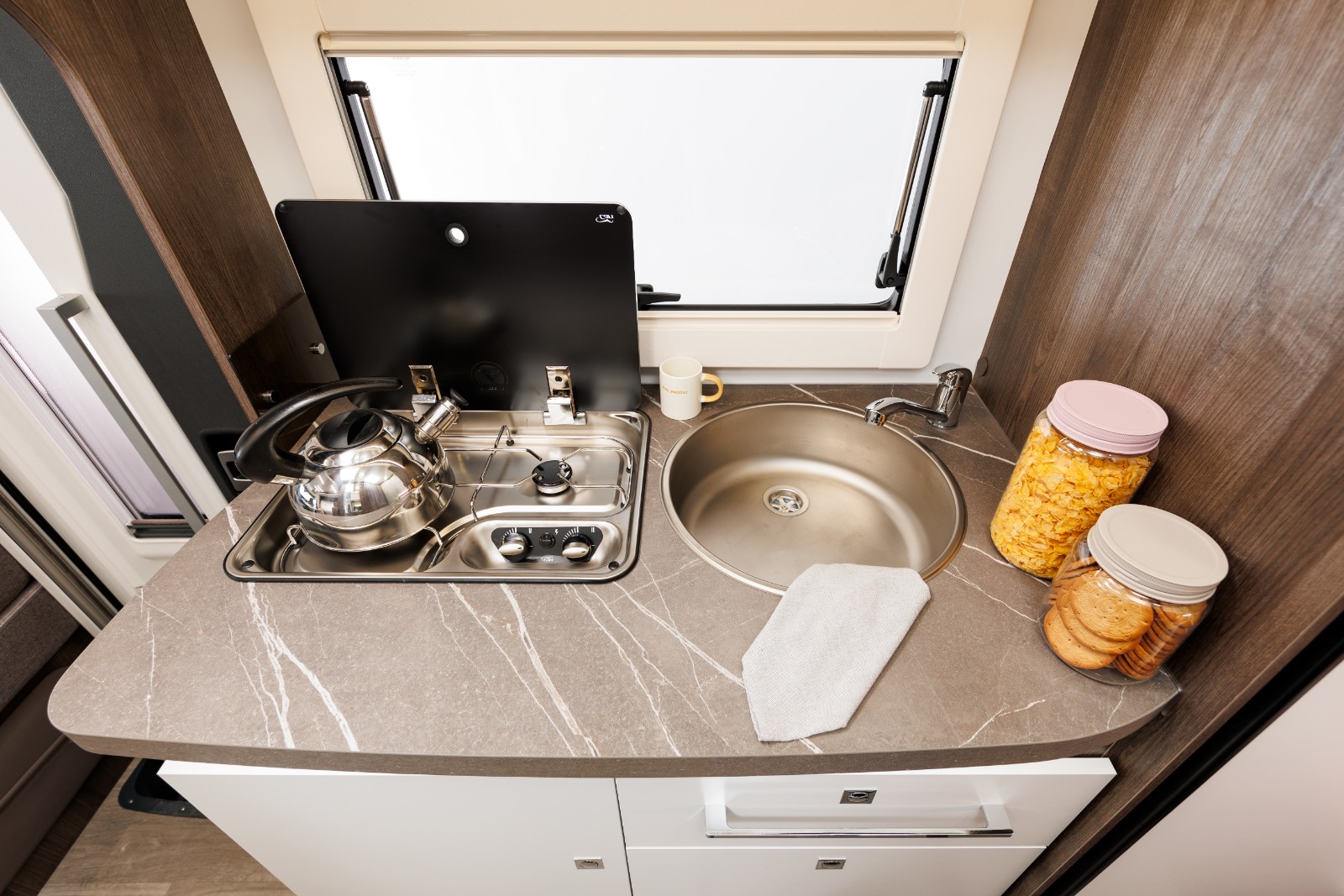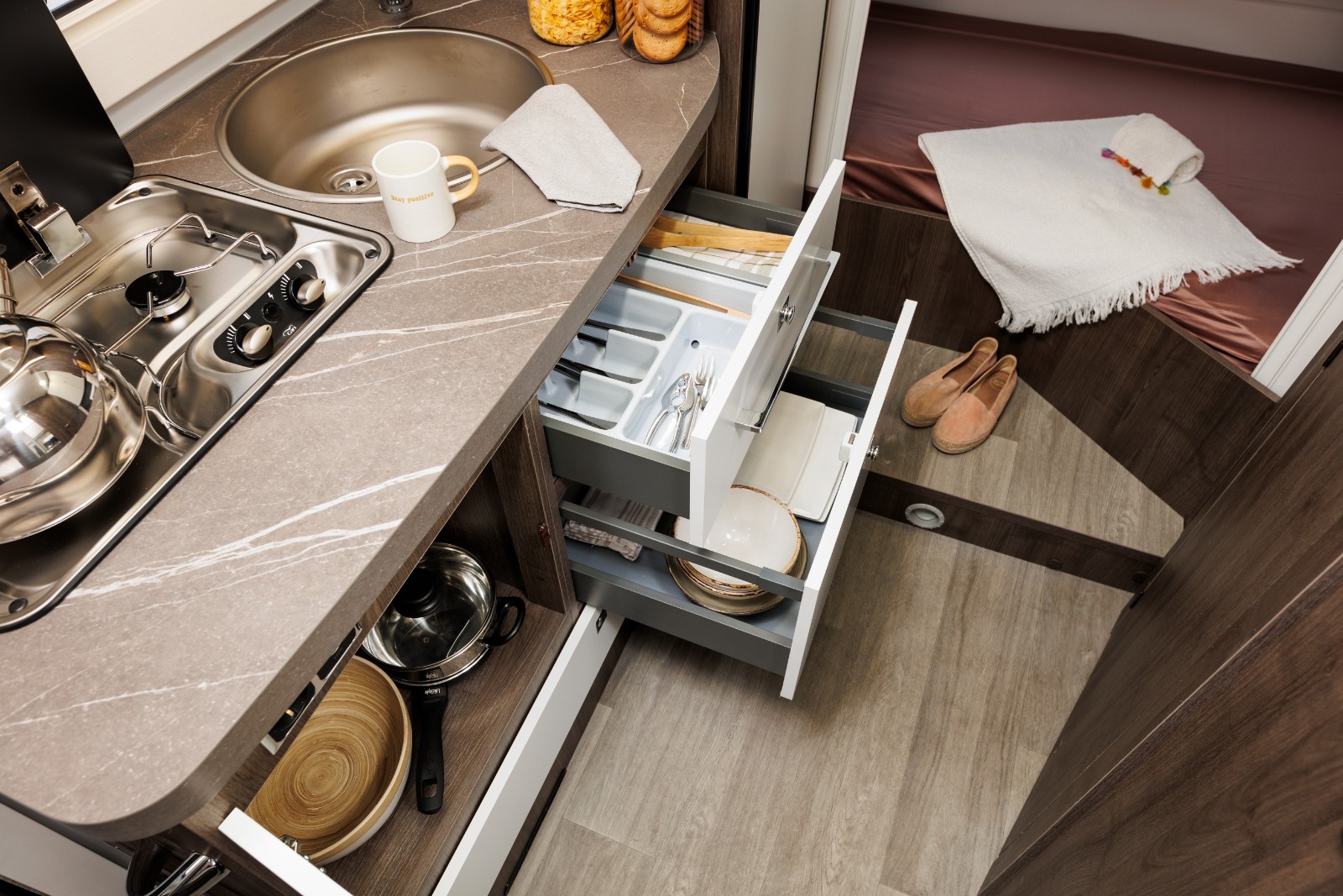 Det stilige og funksjonelle kjøkkenet lar deg enkelt tilberede smakfulle middager, med rikelig skapplass og et stort kjøleskap med egen kjøleskuff og fryser. Her har du alt du trenger for å lage gode måltider på reisen, uten å gå på kompromiss med oppbevaringsplass. I tillegg slipper panorama-takluken over førerhuset inn rikelig med naturlig lys, noe som skaper en luftig og romslig atmosfære i bobilen.