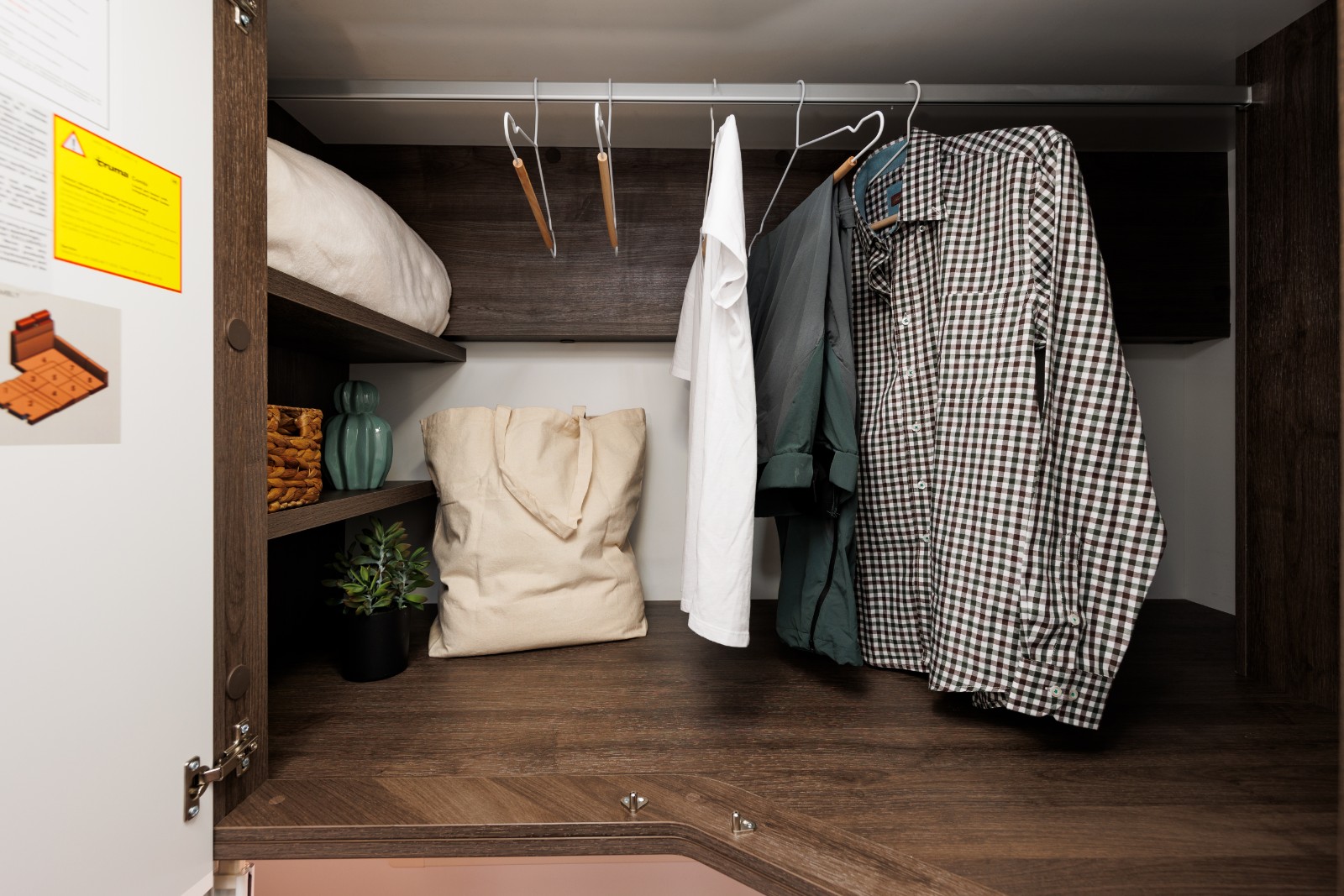 Toalett og dusj er separert, men ligger i samme rom for enda bedre komfort i bobilen. Dette gir en praktisk og funksjonell løsning som gjør det enklere å benytte fasilitetene uten å måtte vente. I tillegg sikrer denne utformingen økt fleksibilitet og en mer komfortabel opplevelse på reisen.