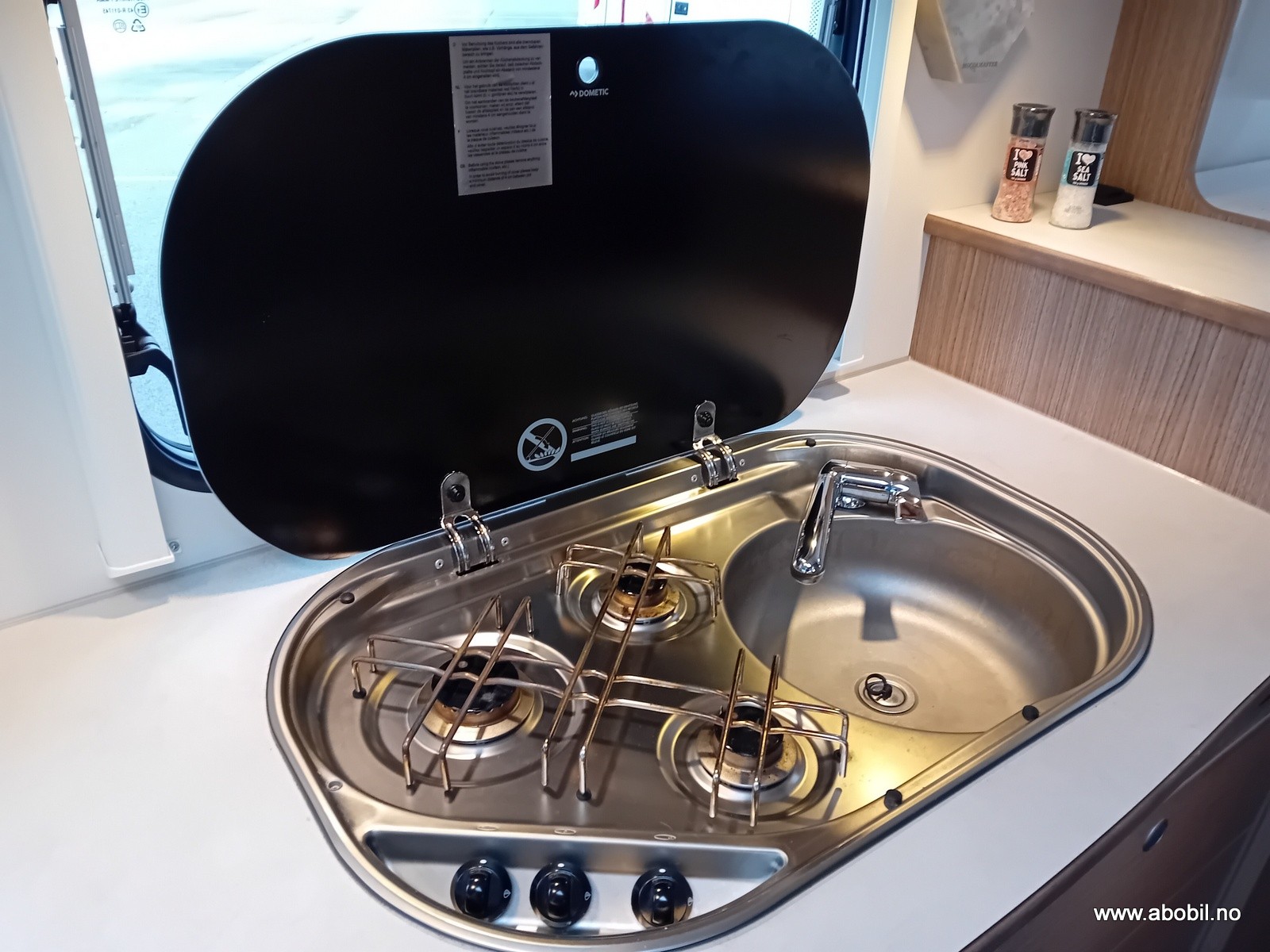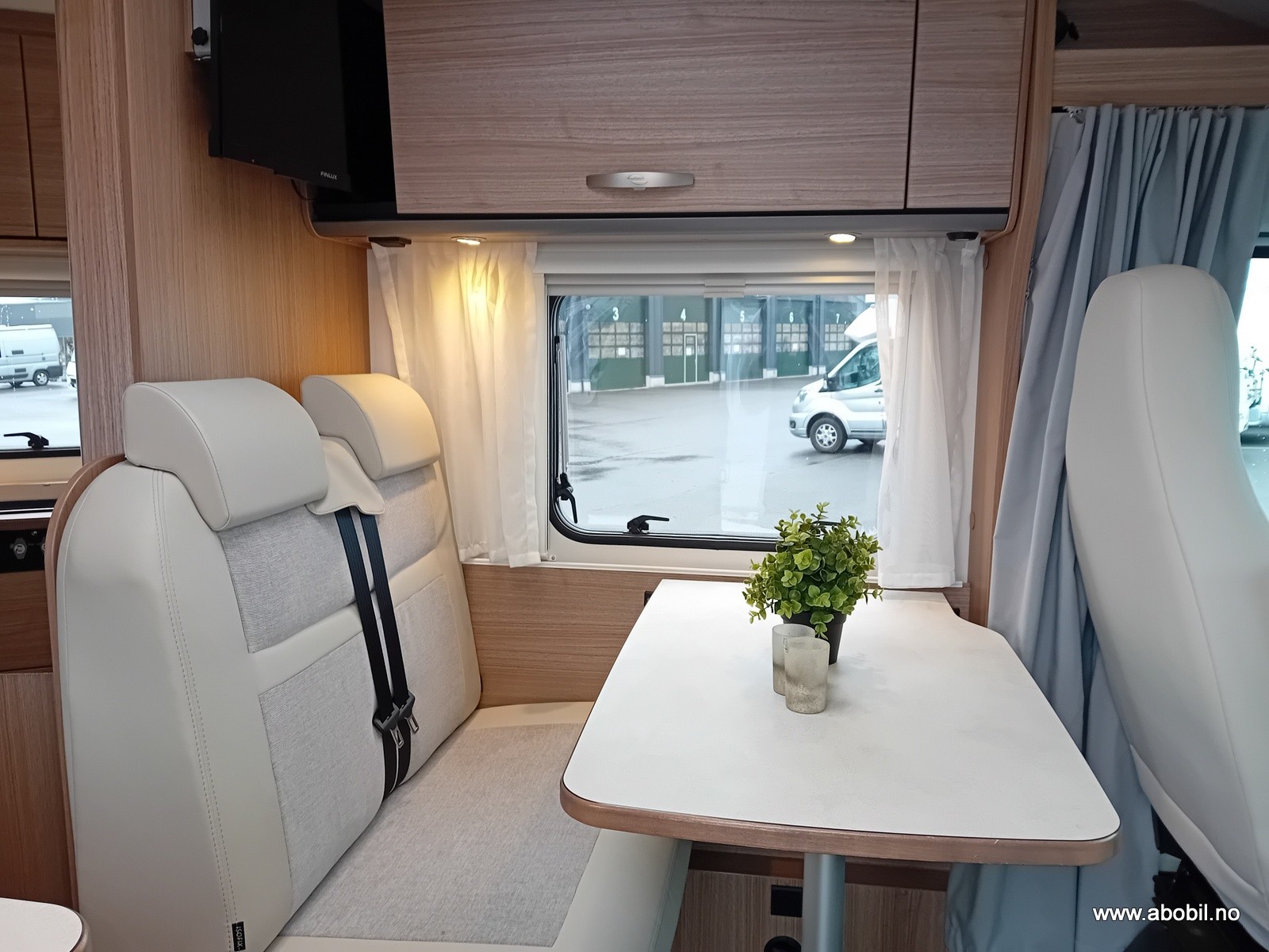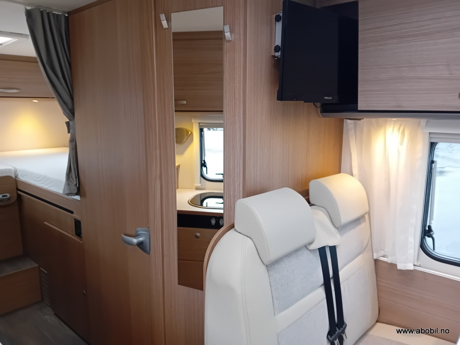 Praktisk planløsning med separat dusj og toalettrom, innholdsrikt kjøkken med god skapplass, 3 kokebluss og stort kjøleskap. Her får du også en romslig sittegruppe med svingbare forseter.