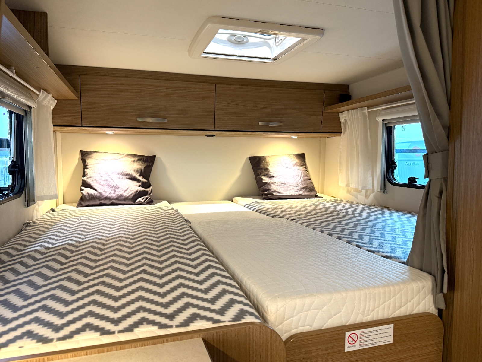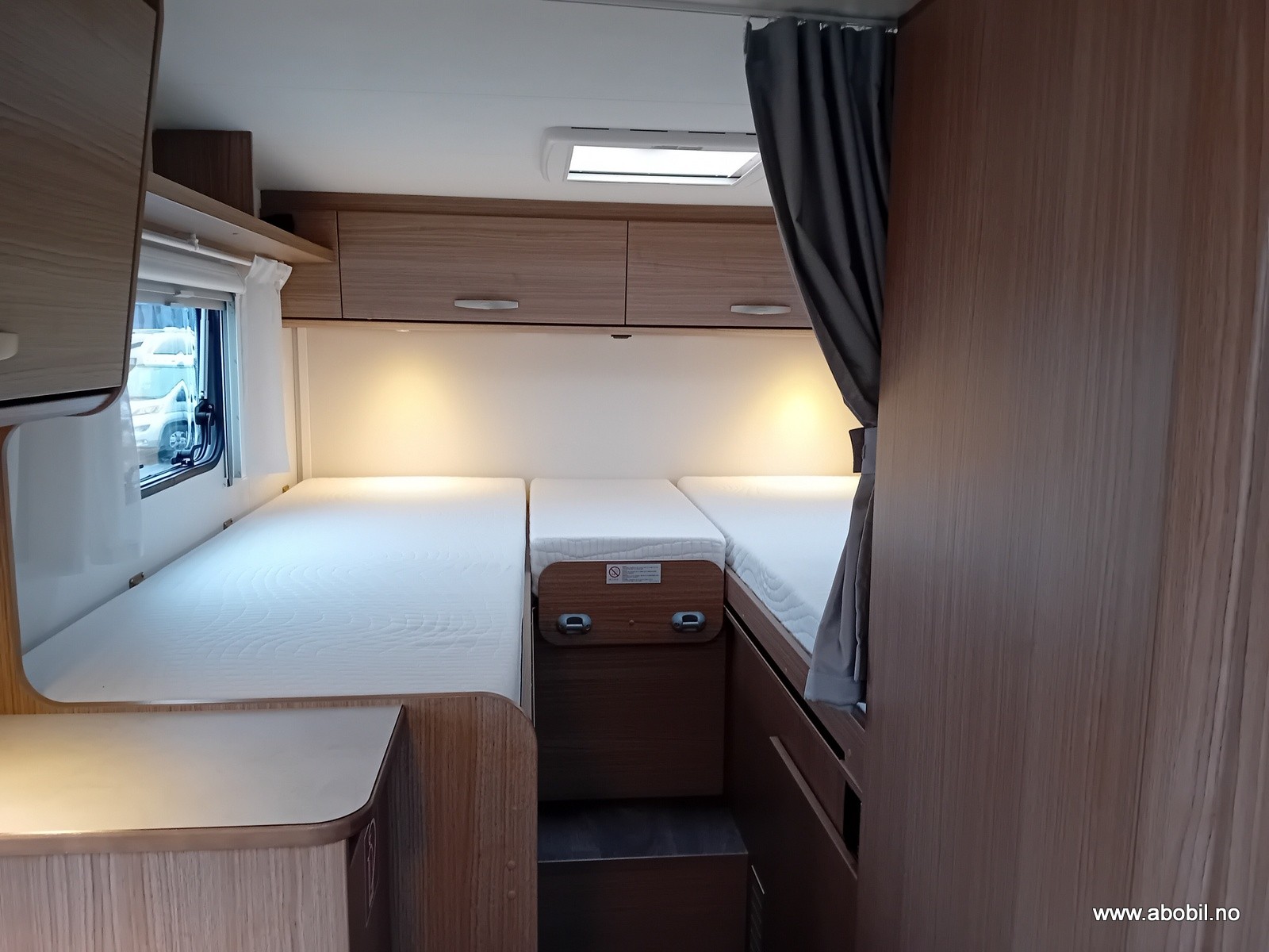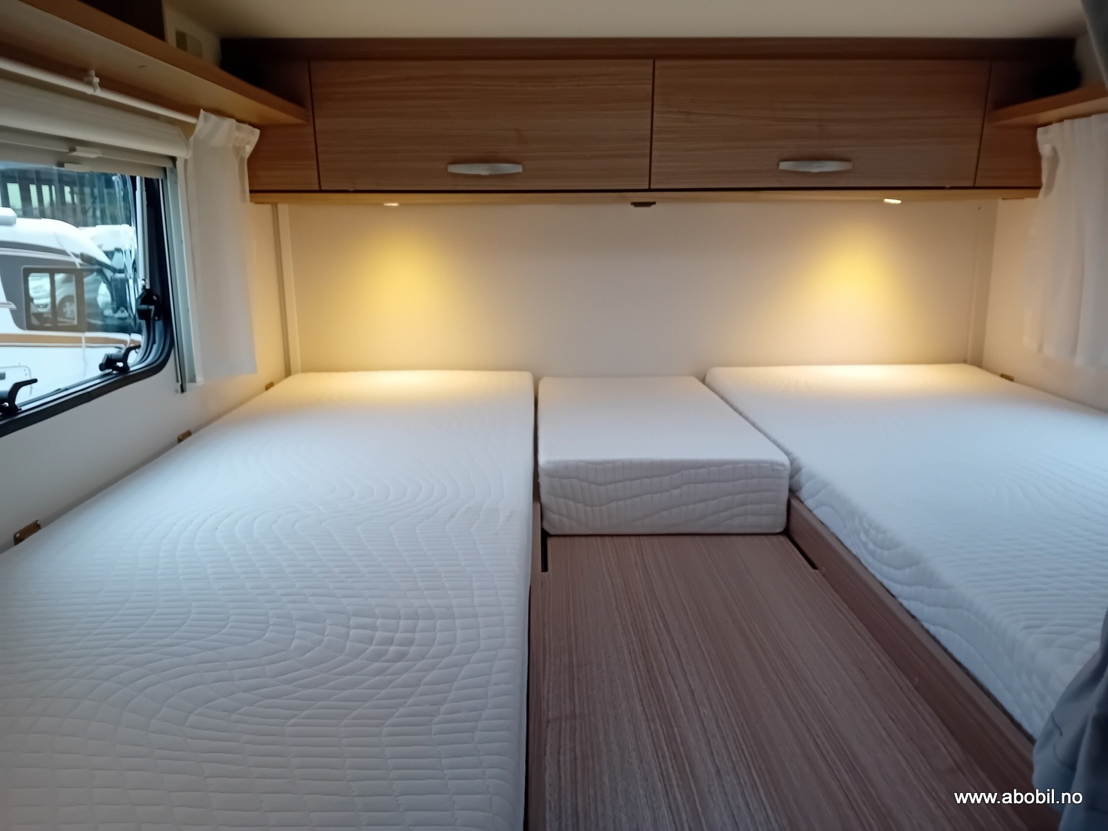 Bobilen er utstyrt med 2 enkle senger bak som enkelt kan gjøres om til en stor dobbeltseng. Stor garasje under sengene.