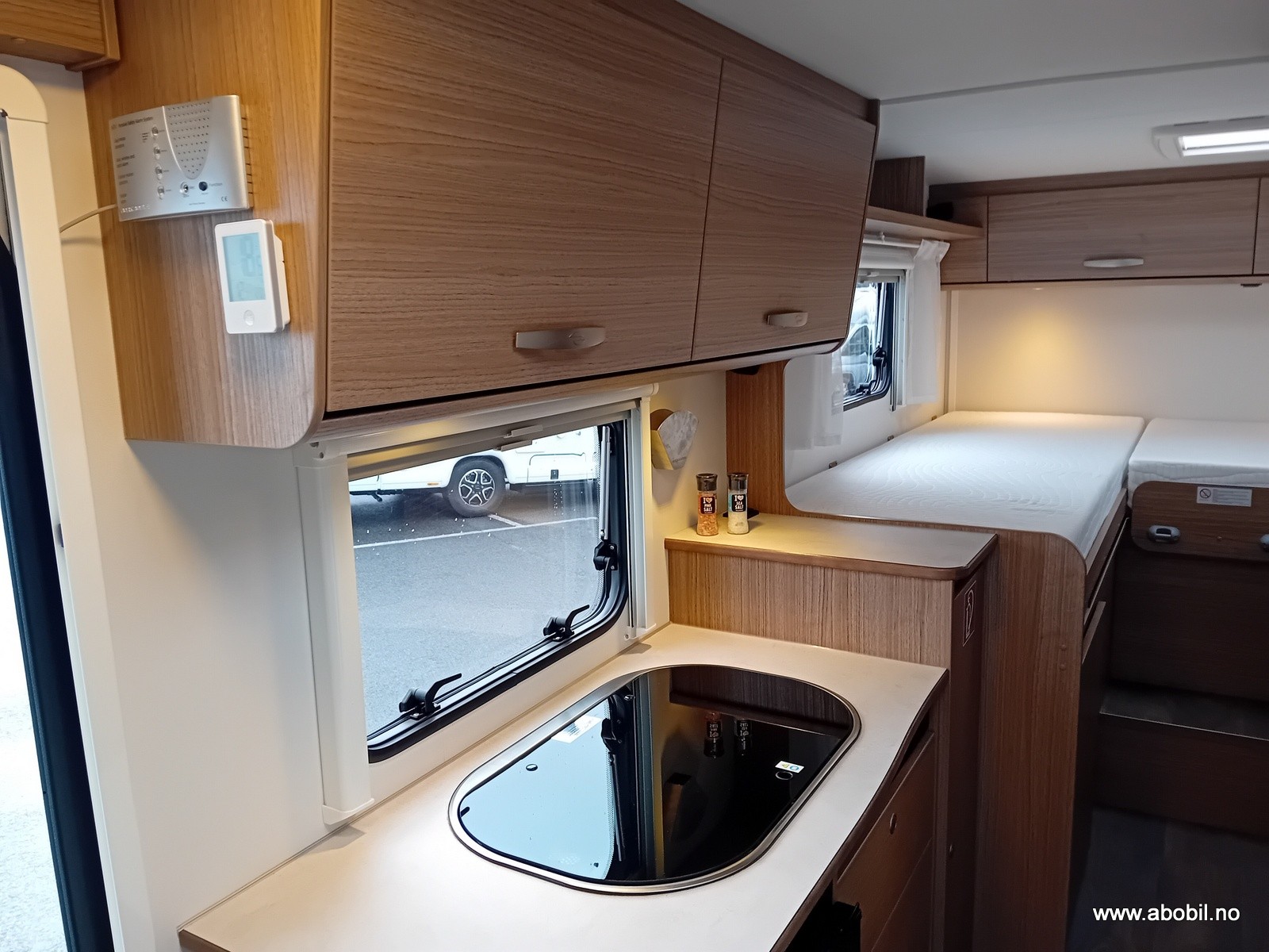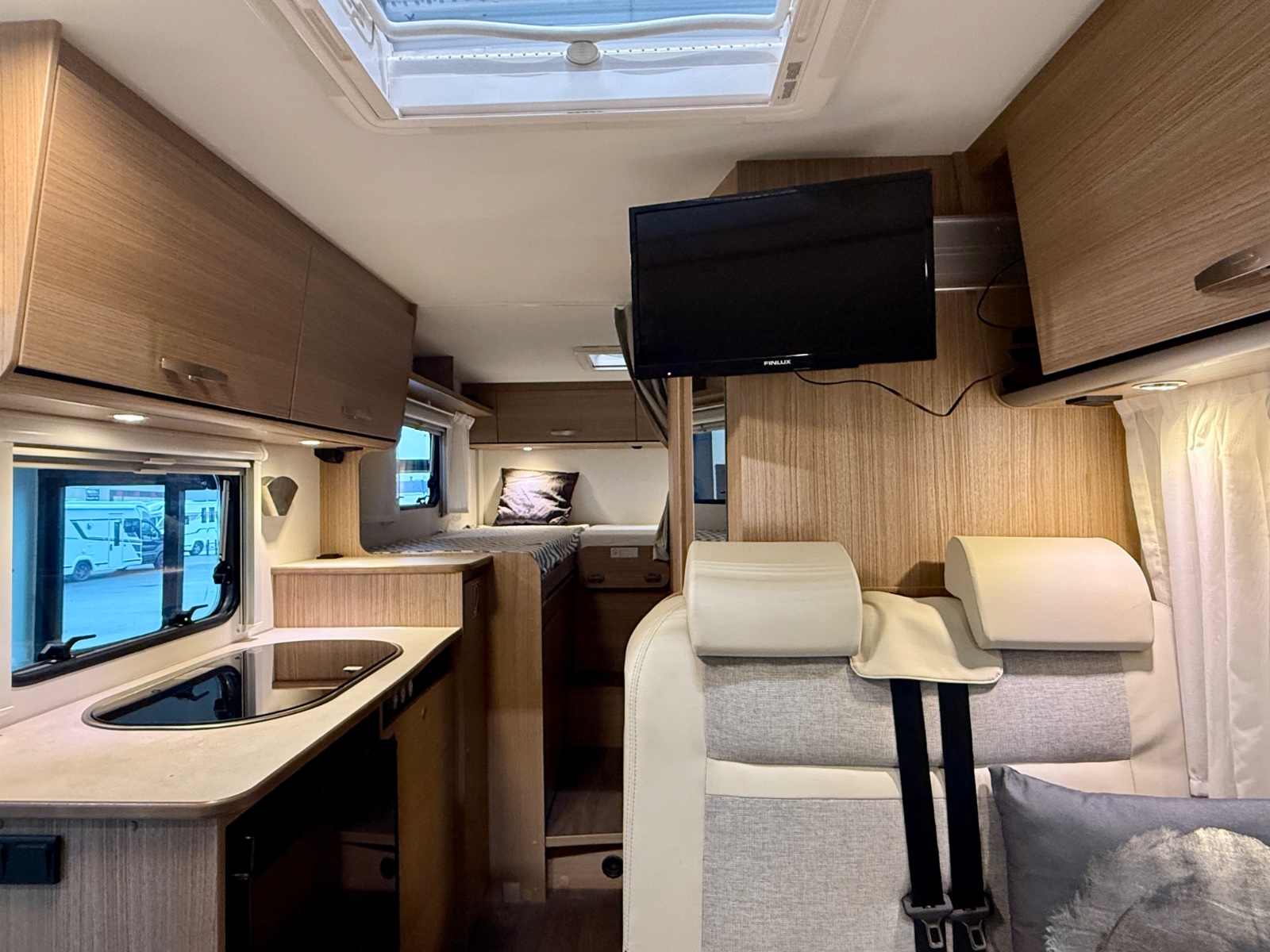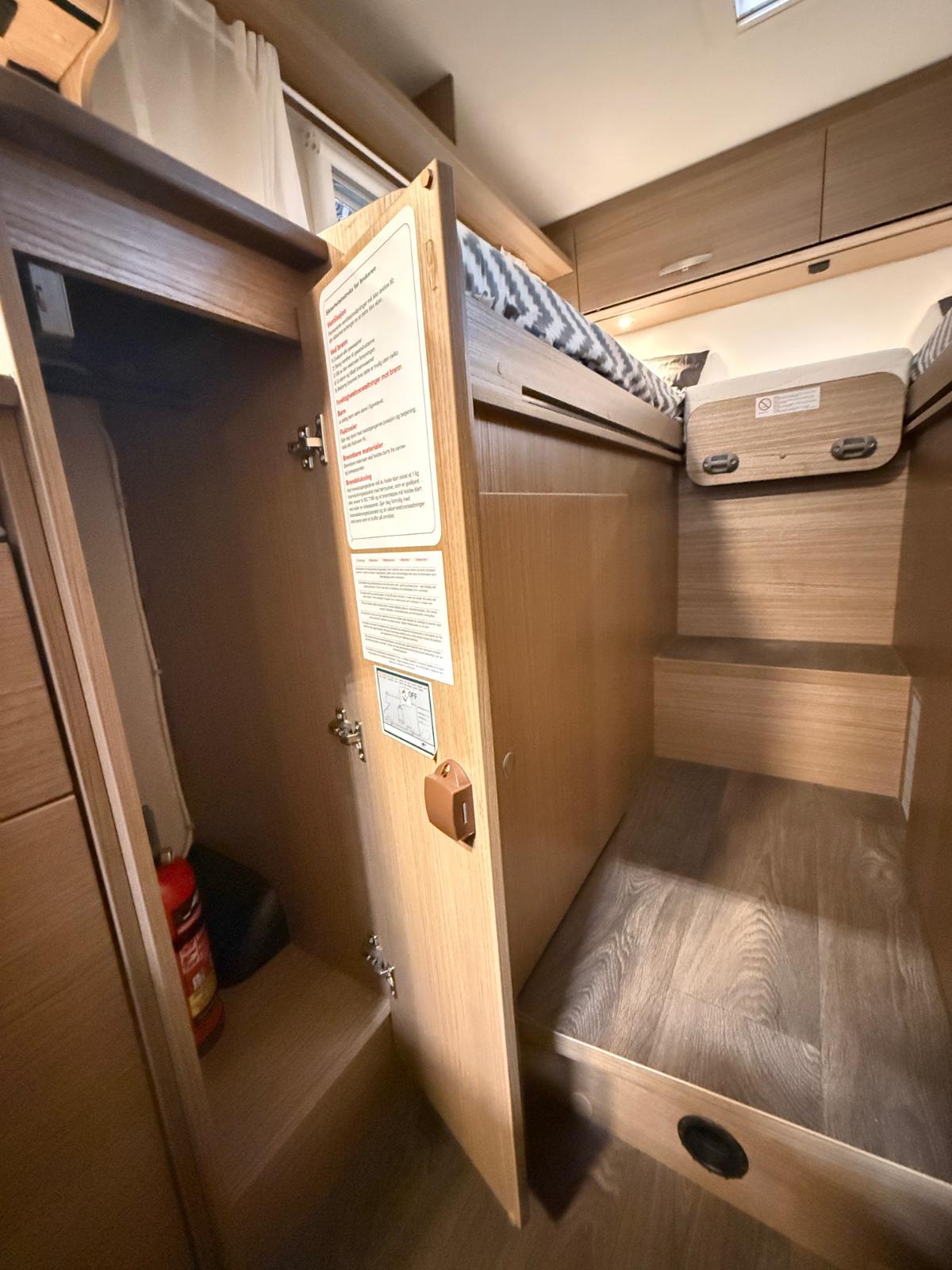 Bobilen er utstyrt med 2 enkle senger bak som enkelt kan gjøres om til en stor dobbeltseng. Stor garasje under sengene.