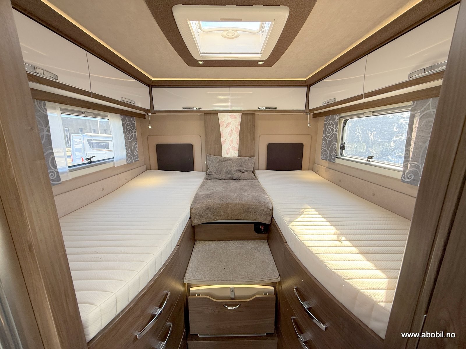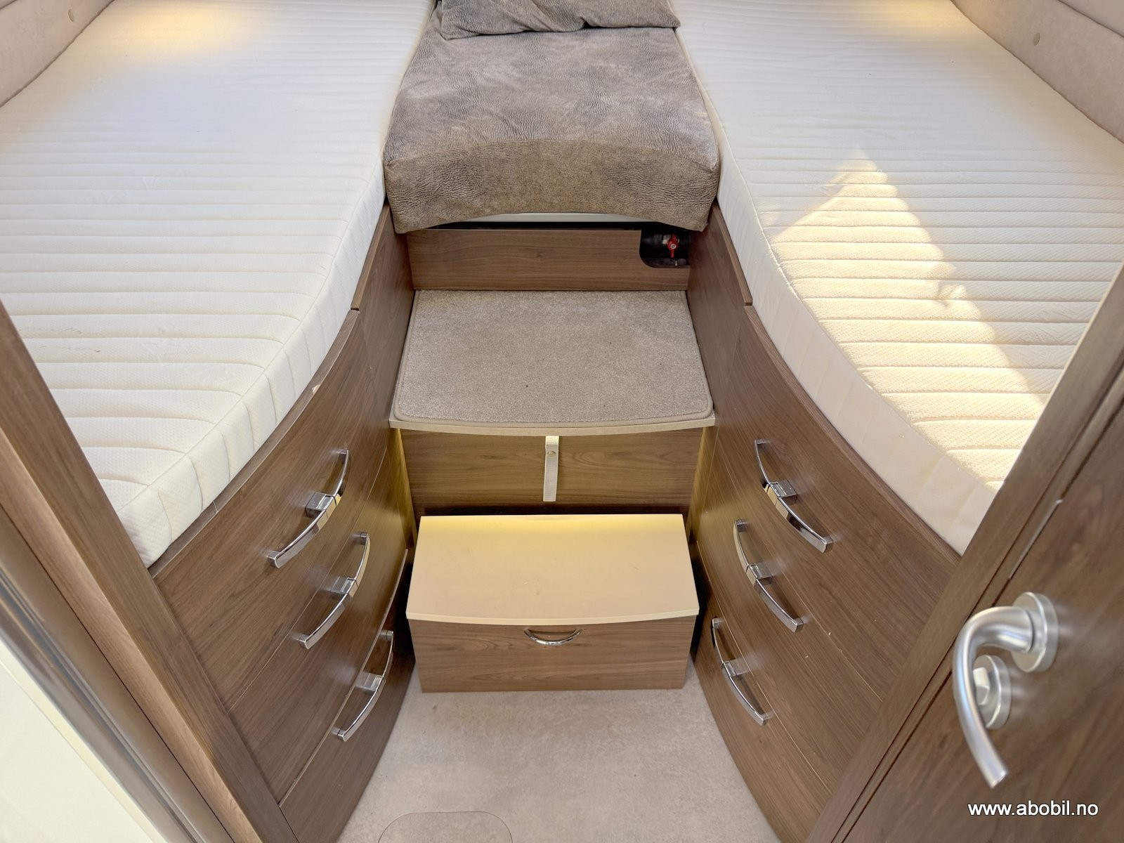 Bakerst i bilen finner du to komfortable enkeltsenger med trinn opp og rikelig oppbevaring under og over.