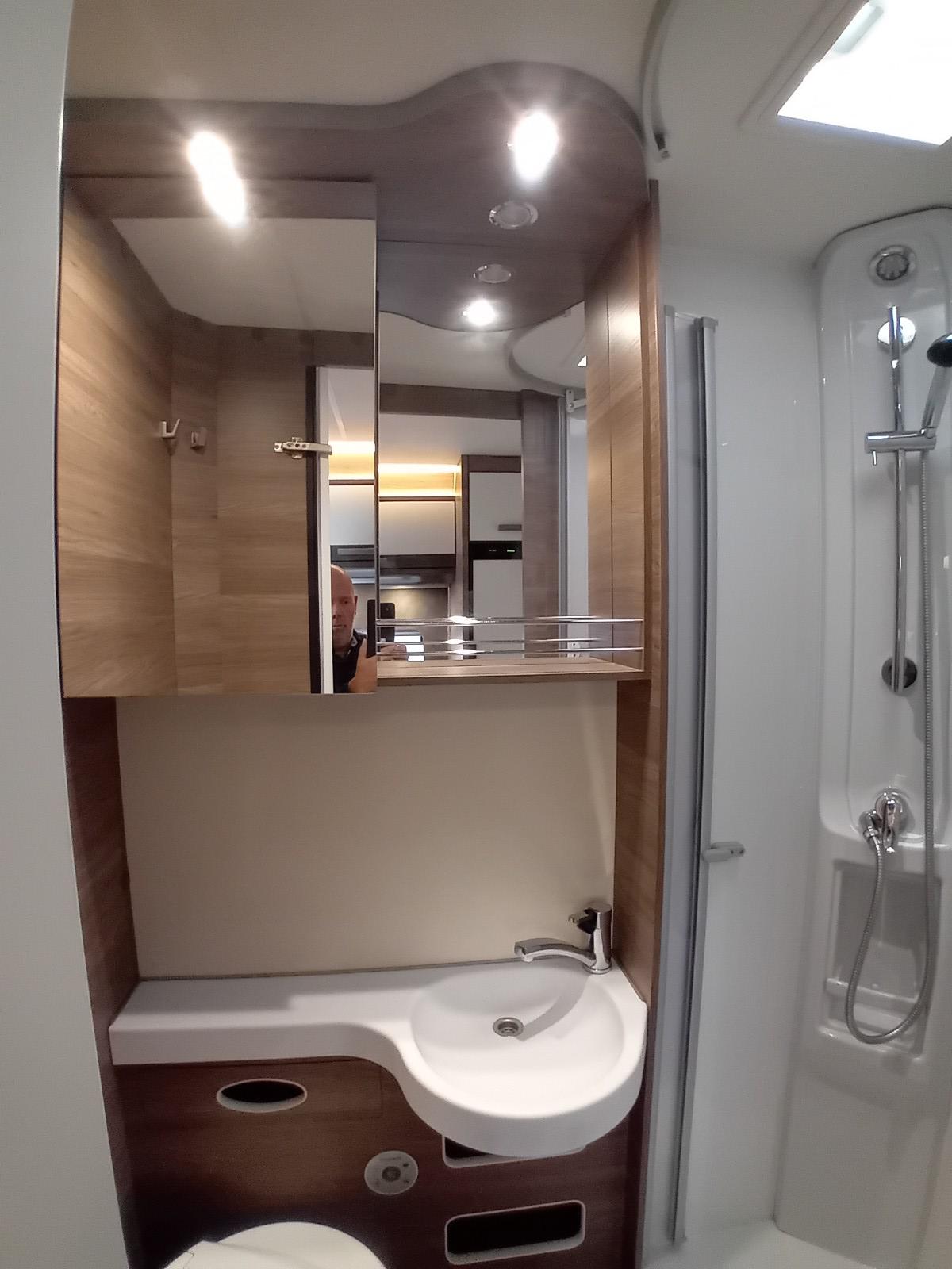 Baderommet er i eget separat rom med svingbart toalett og flotte detaljer som stort speil, såpeholdere, skapplass for toalettsaker og en egen takluke. Takluken har myggnetting.