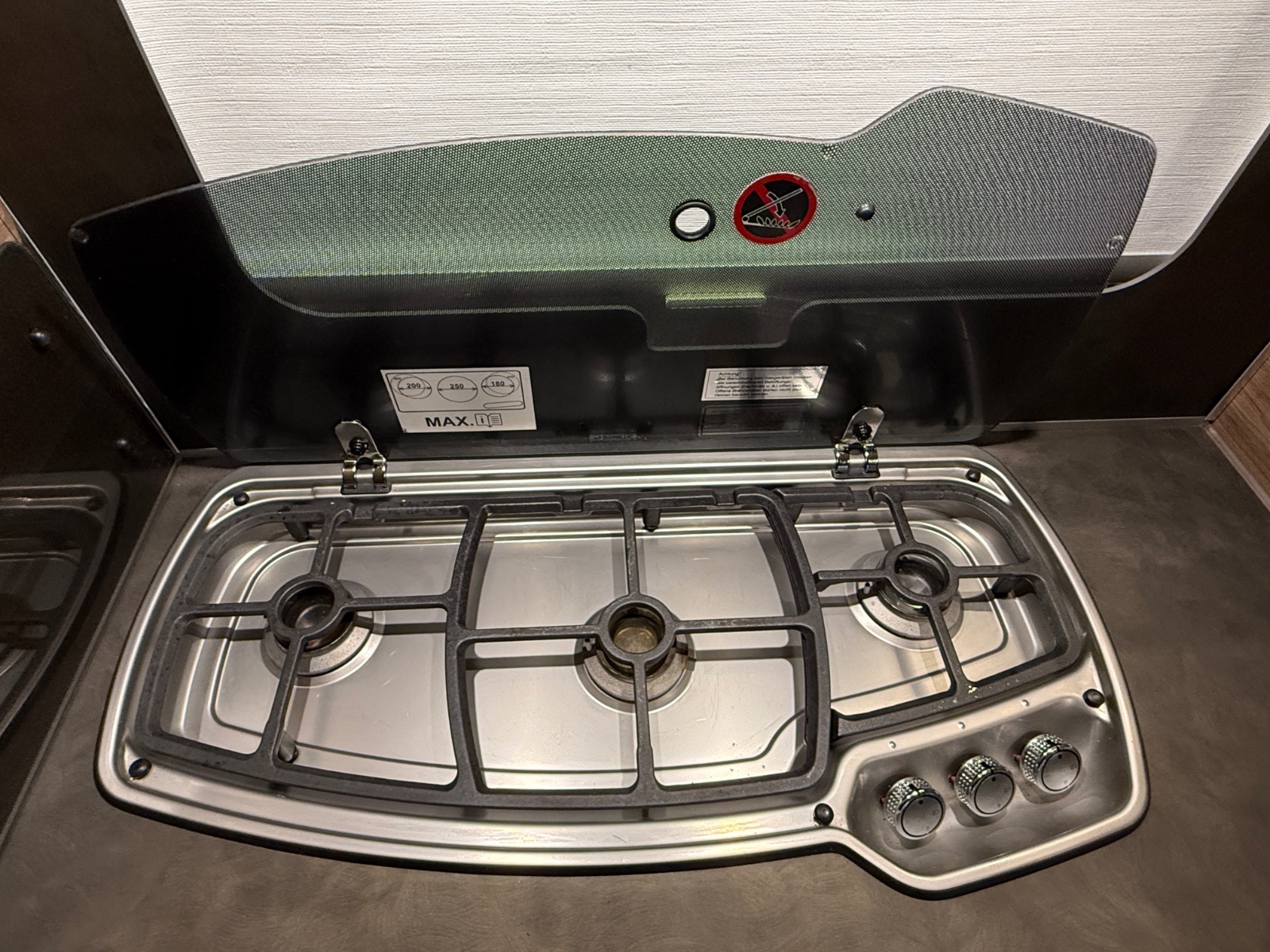 Tre gassbluss med elektrisk tenning og egen glassplate som beskytter kokebluss + gir mer benkeplass.