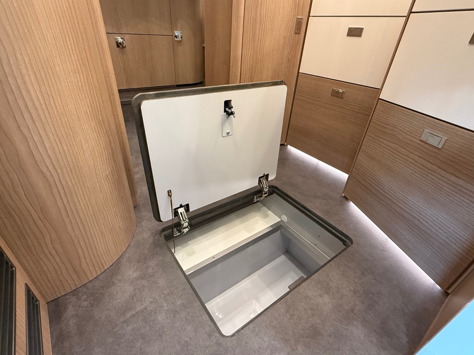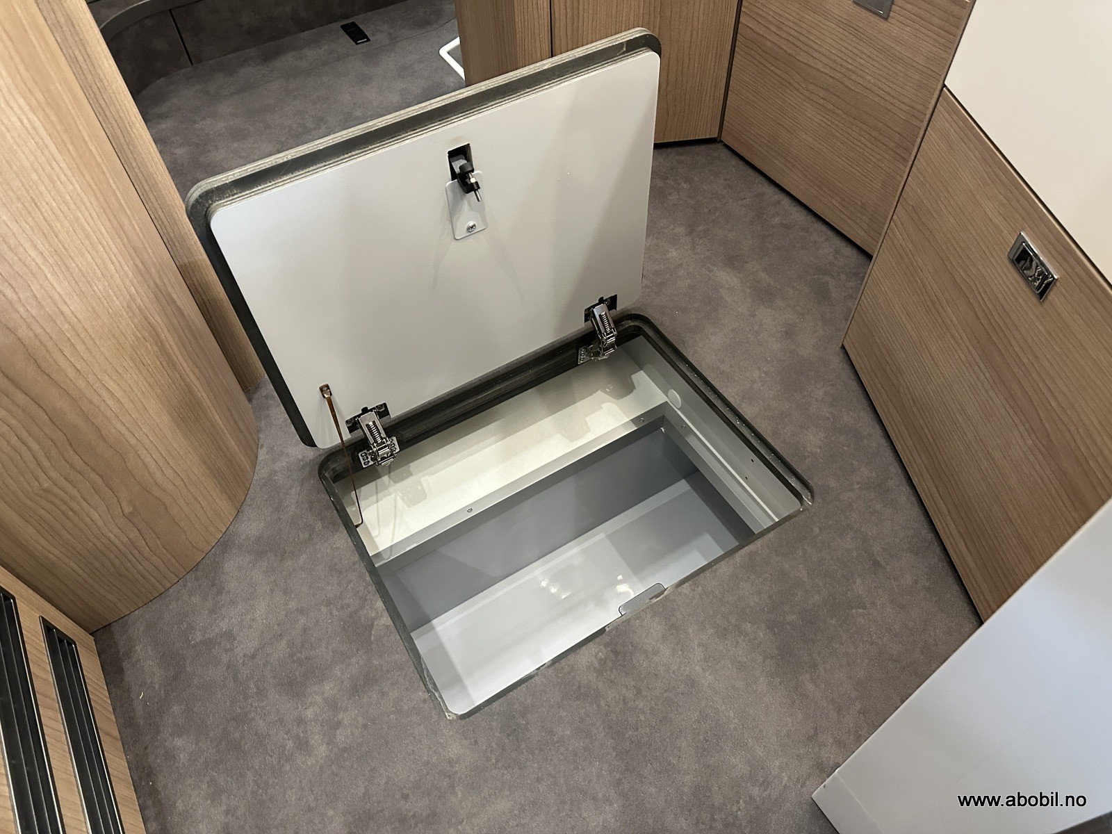Stort oppbevaringsrom i dobbeltgulv – tilgang både innenfra og utenfra.