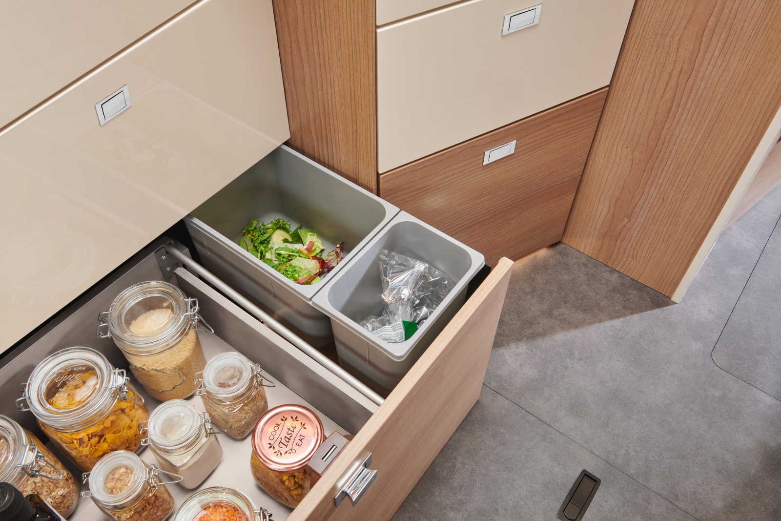 6 romslige skuffer med softclose – inkludert bestikkinndeling i tre.