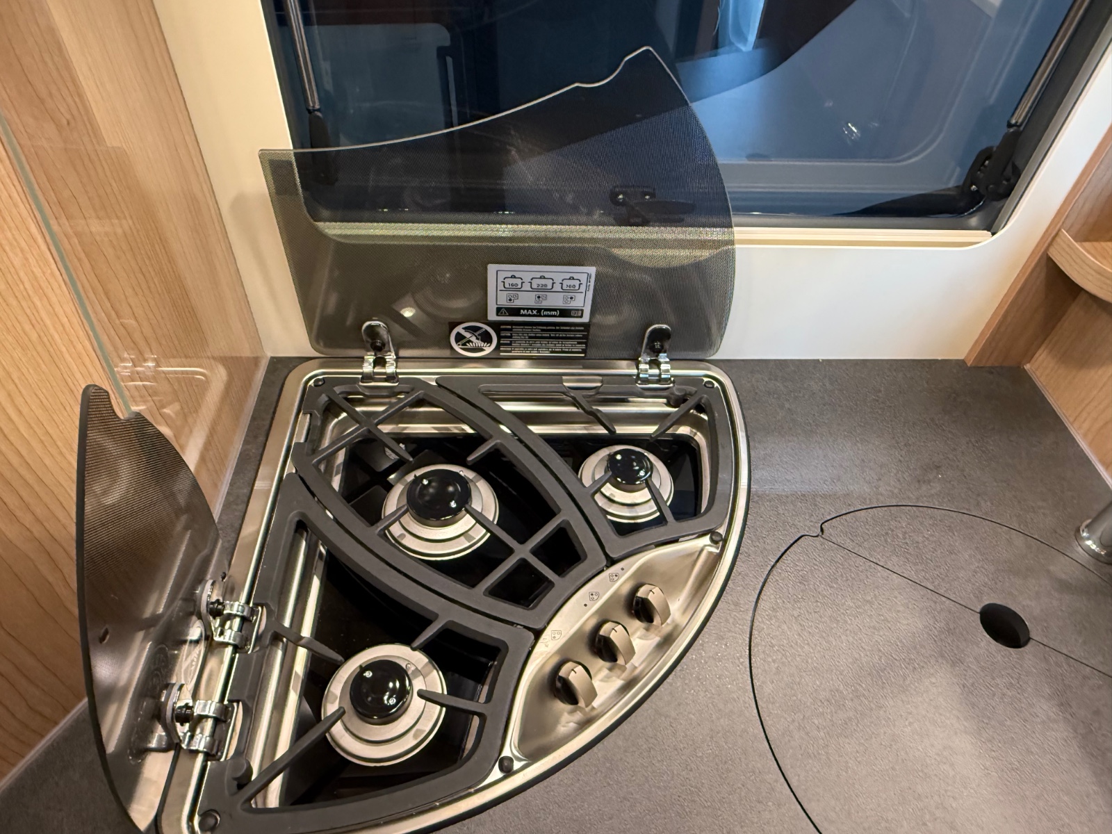 Kokeapparat med 3 gassbluss, delt glassdeksel og lett rengjøring.