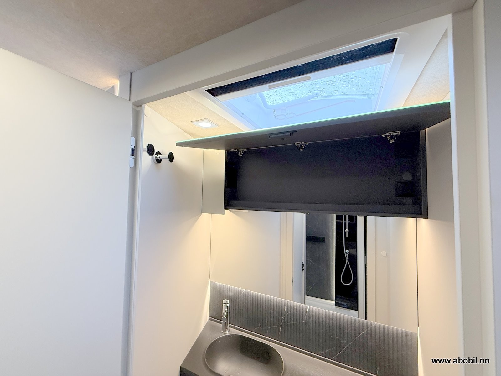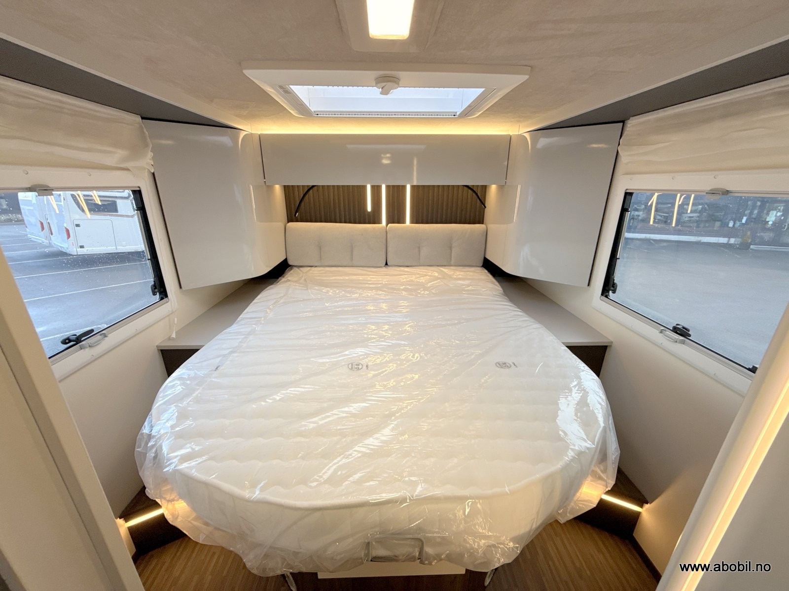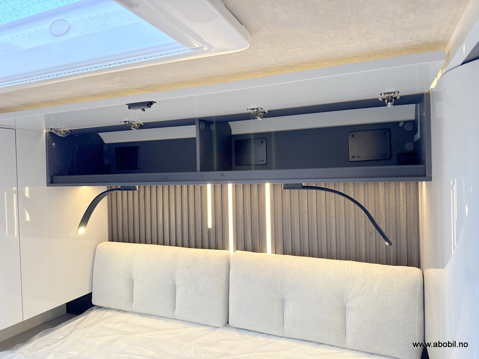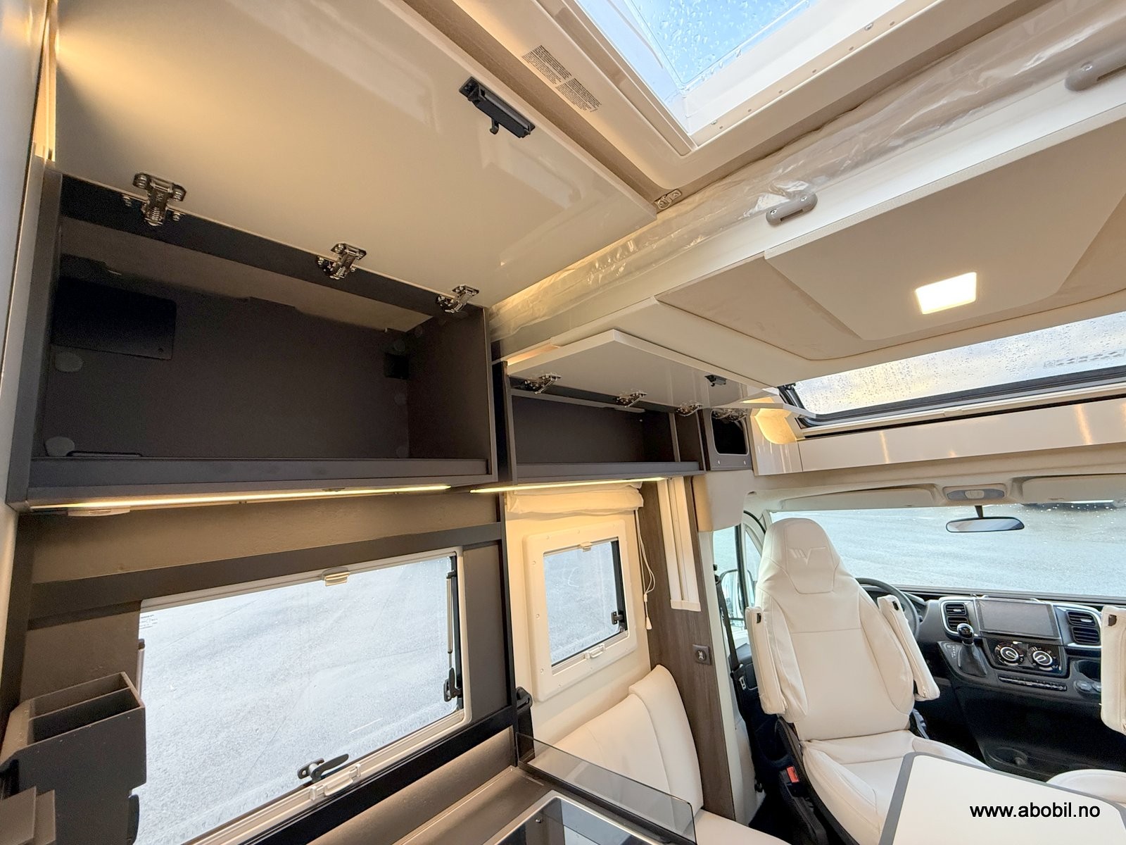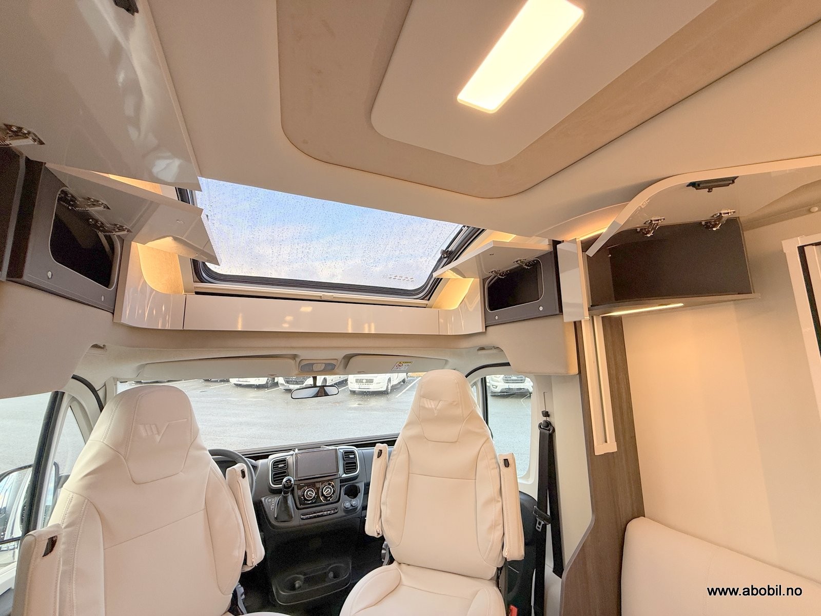 Bobilen har store vinduer, flere takluker og panoramatak gir maksimalt dagslys og høy bokomfort i et moderne miljø.