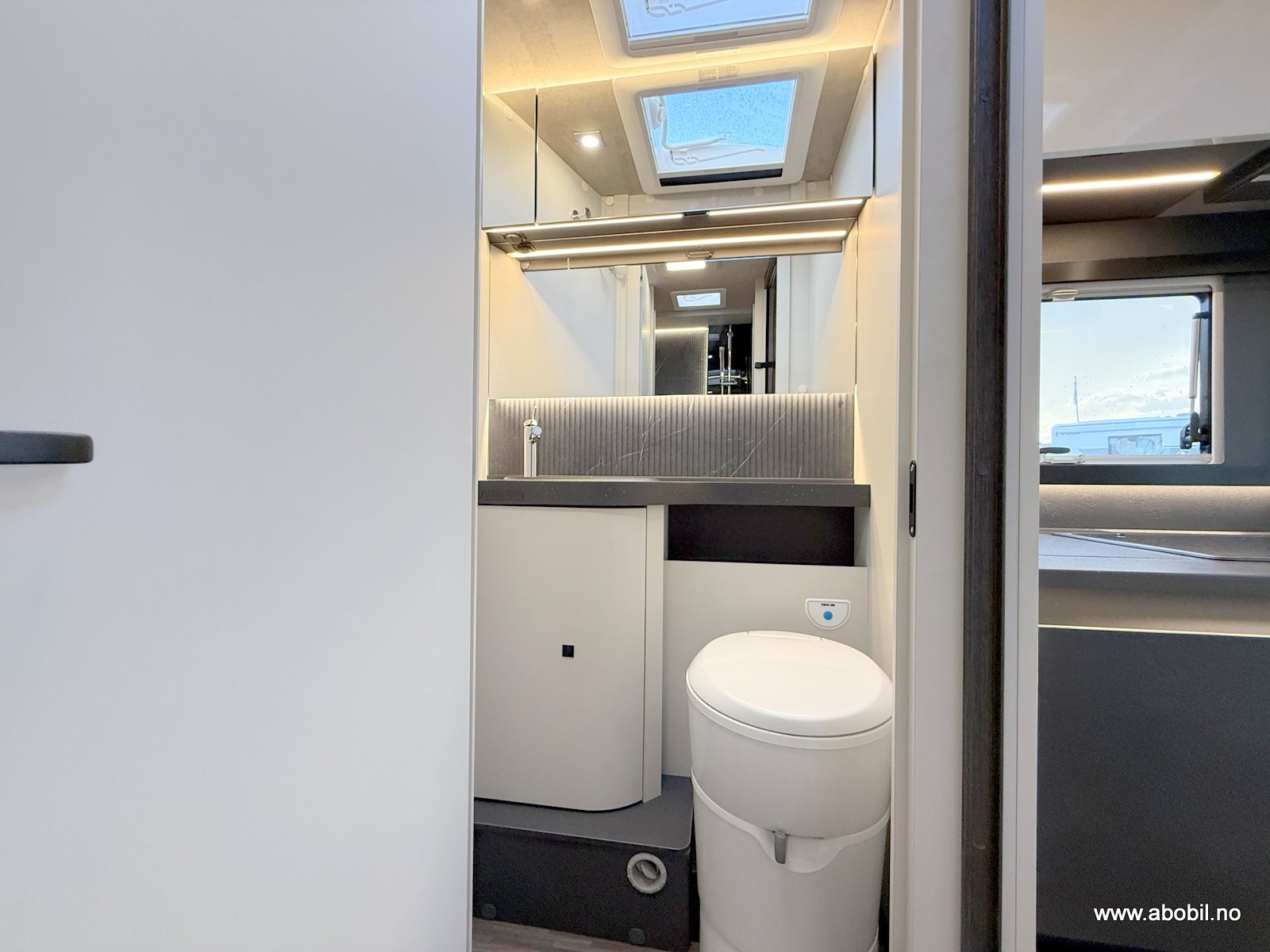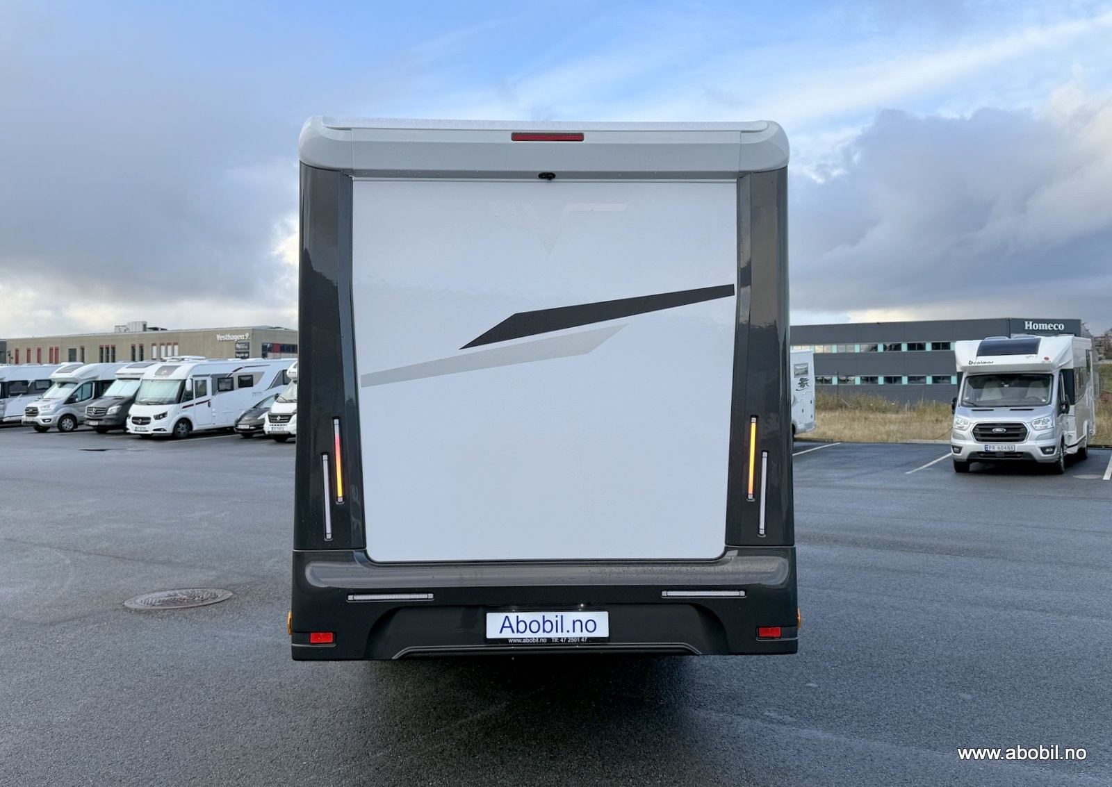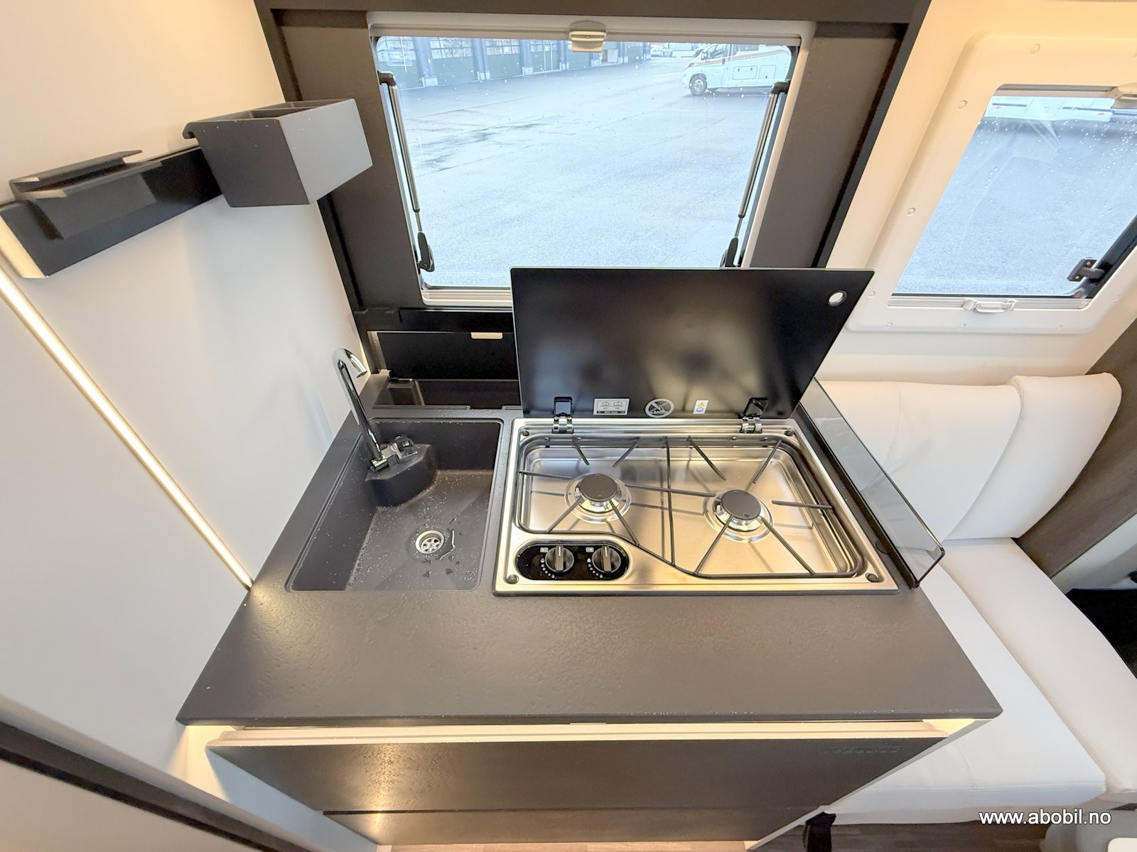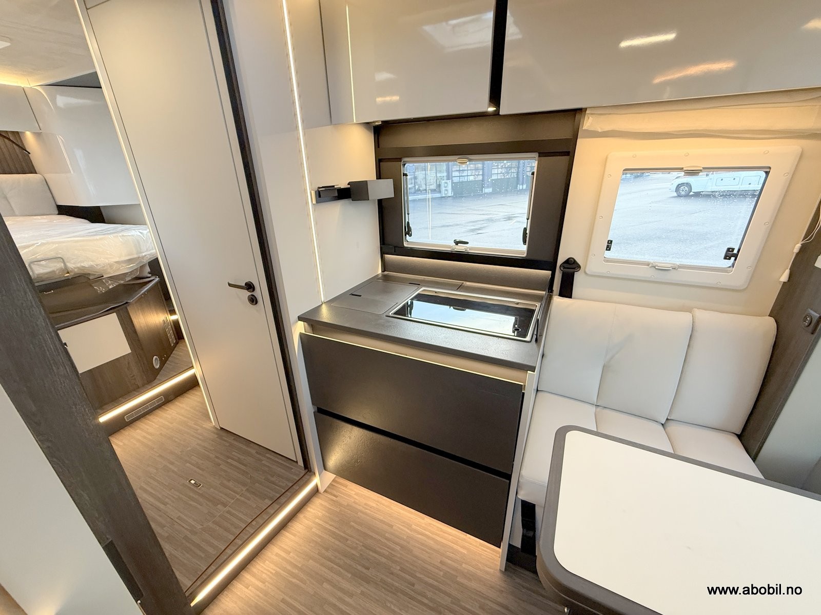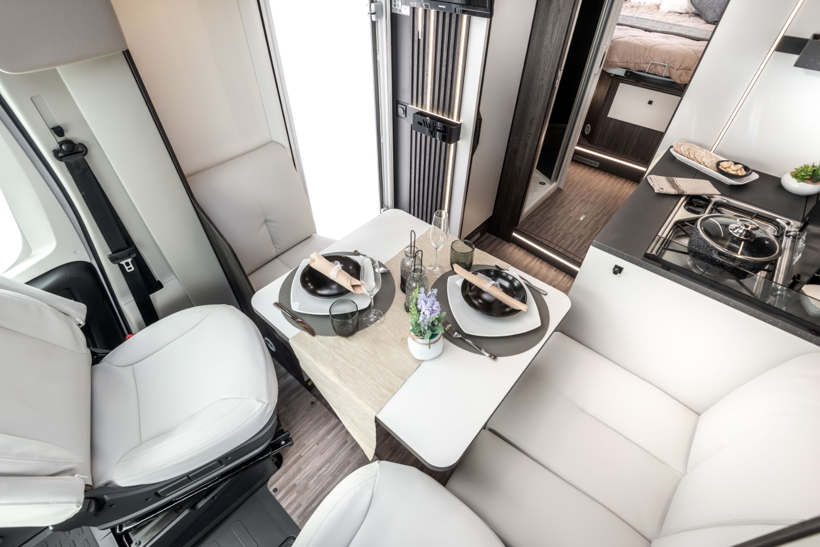 Bobilen har store vinduer, flere takluker og panoramatak gir maksimalt dagslys og høy bokomfort i et moderne miljø.
