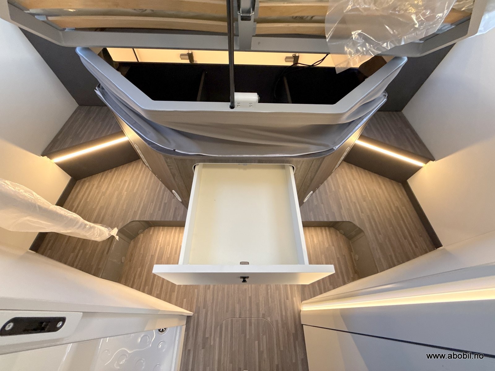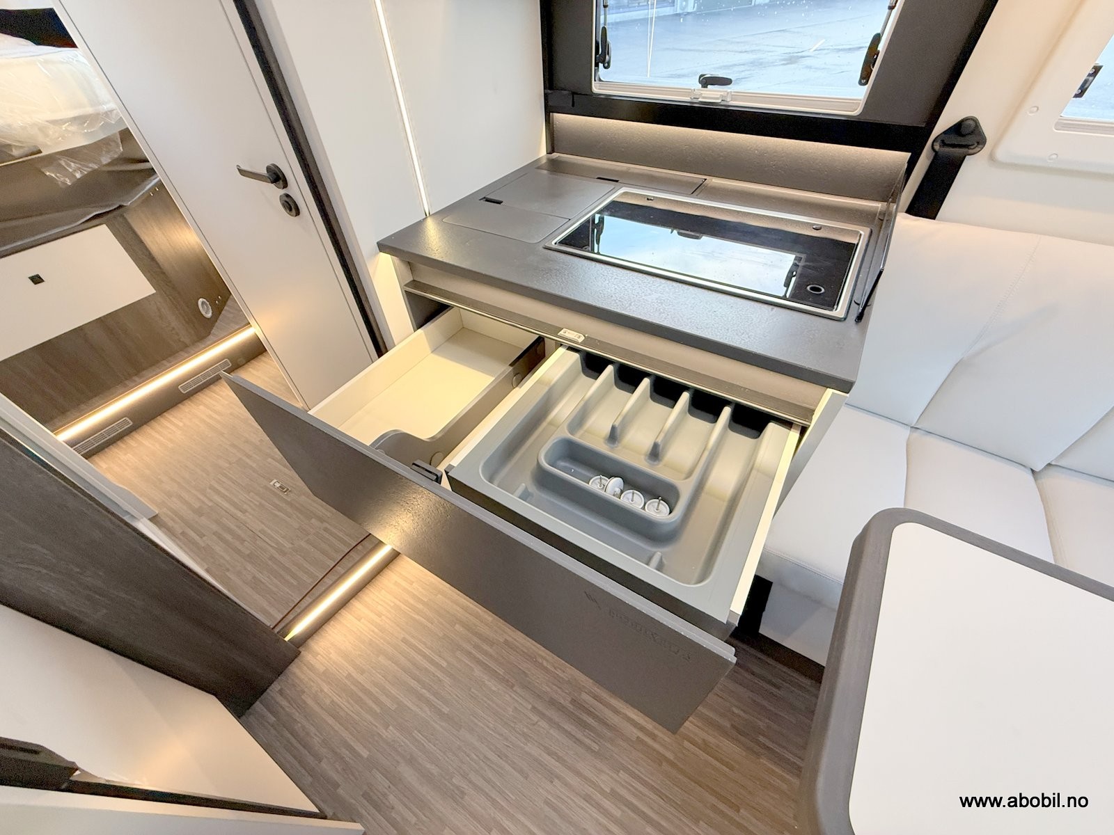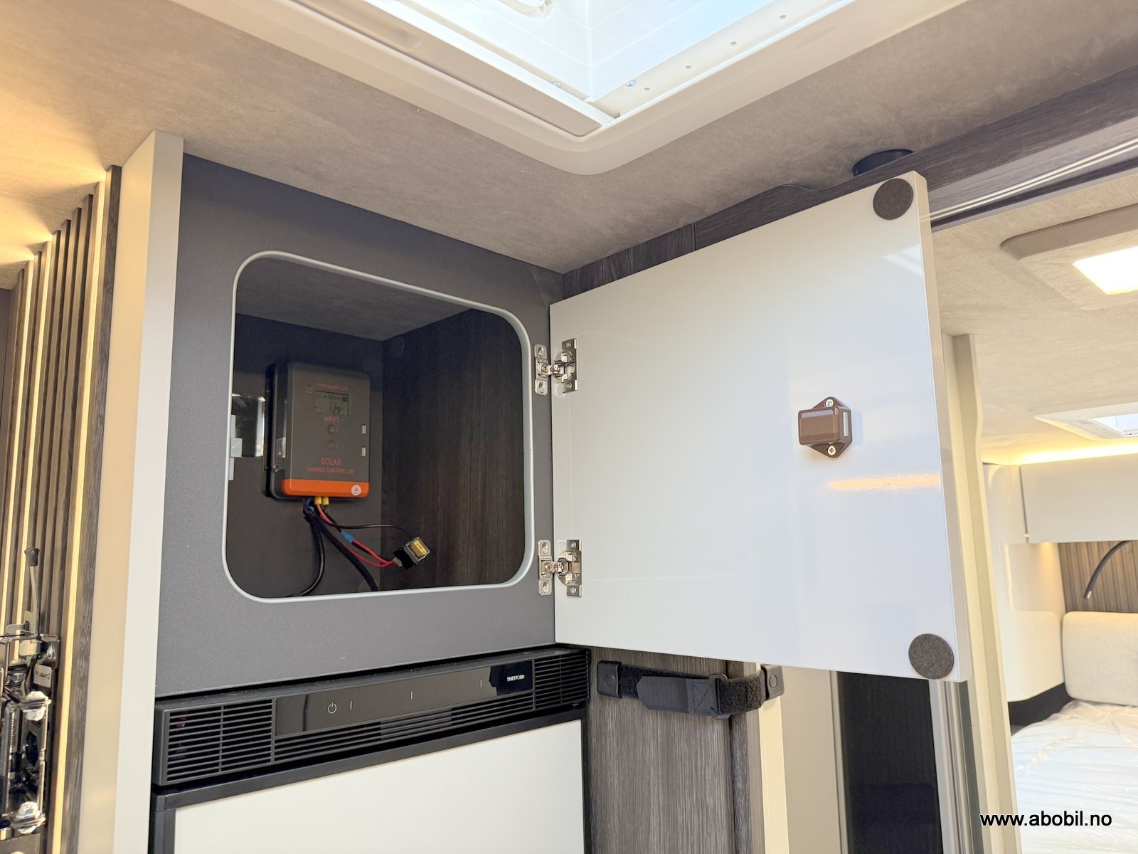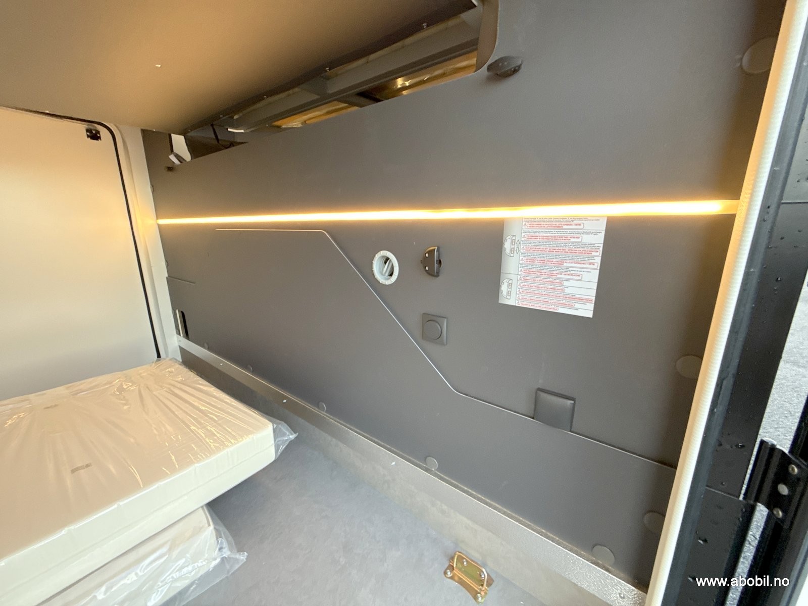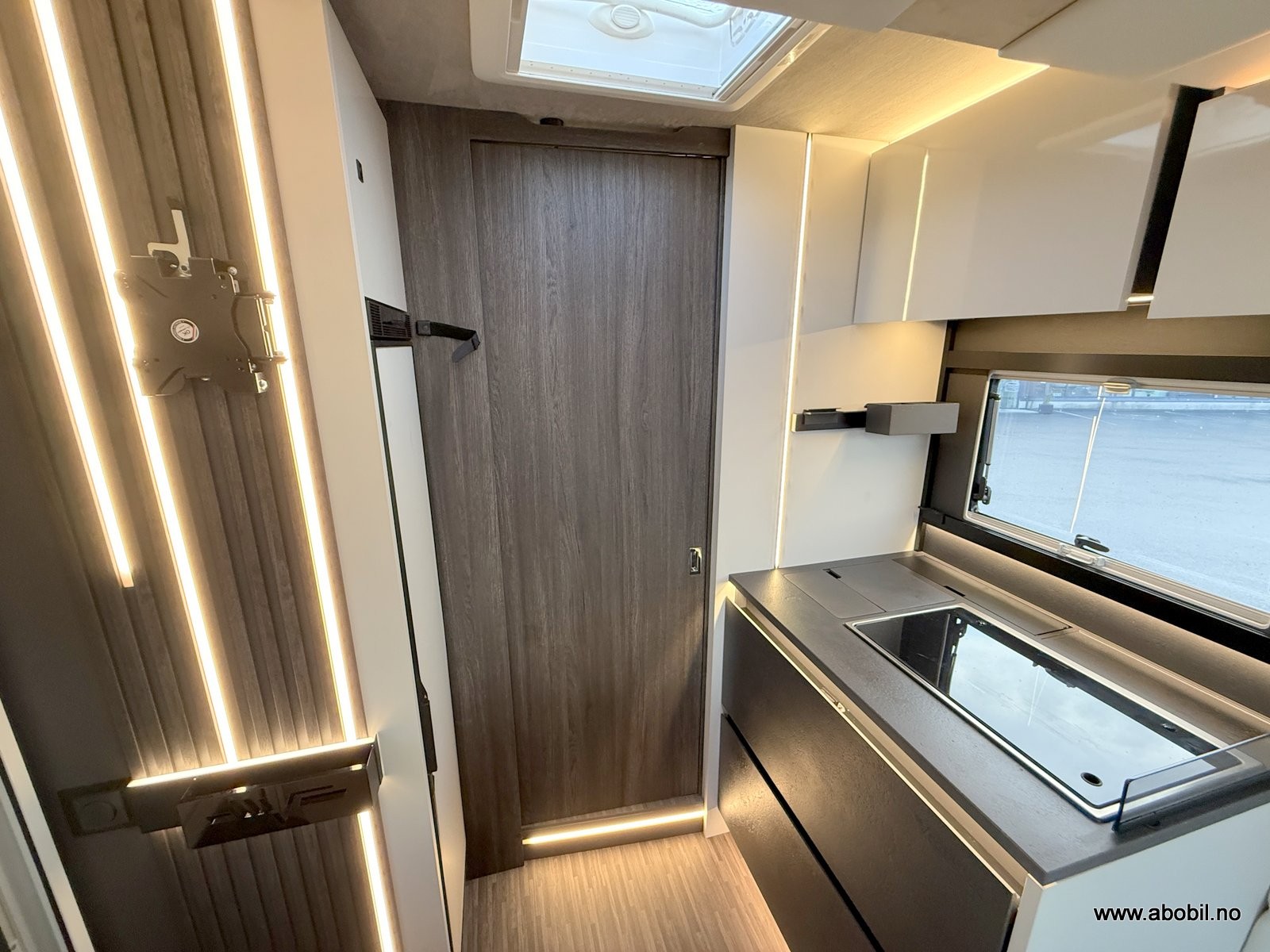 Bobilen har store vinduer, flere takluker og panoramatak gir maksimalt dagslys og høy bokomfort i et moderne miljø.