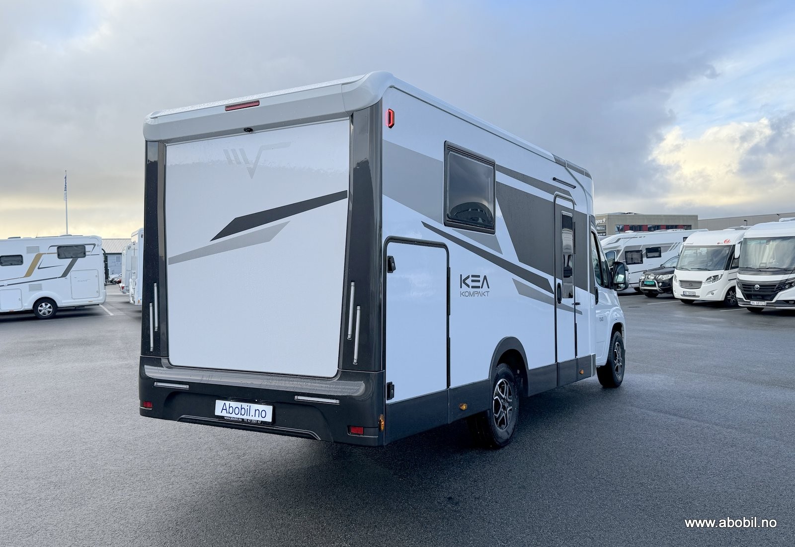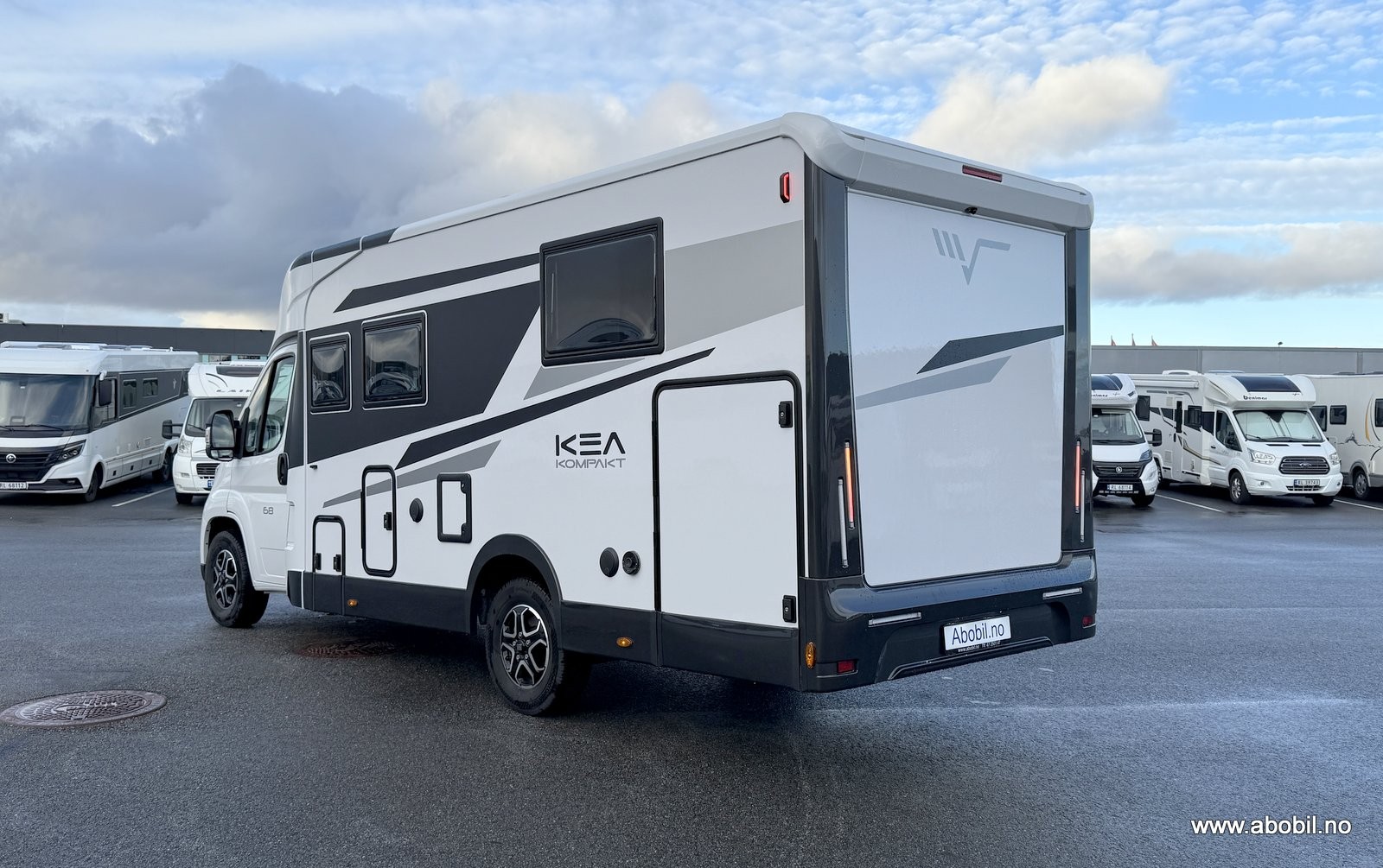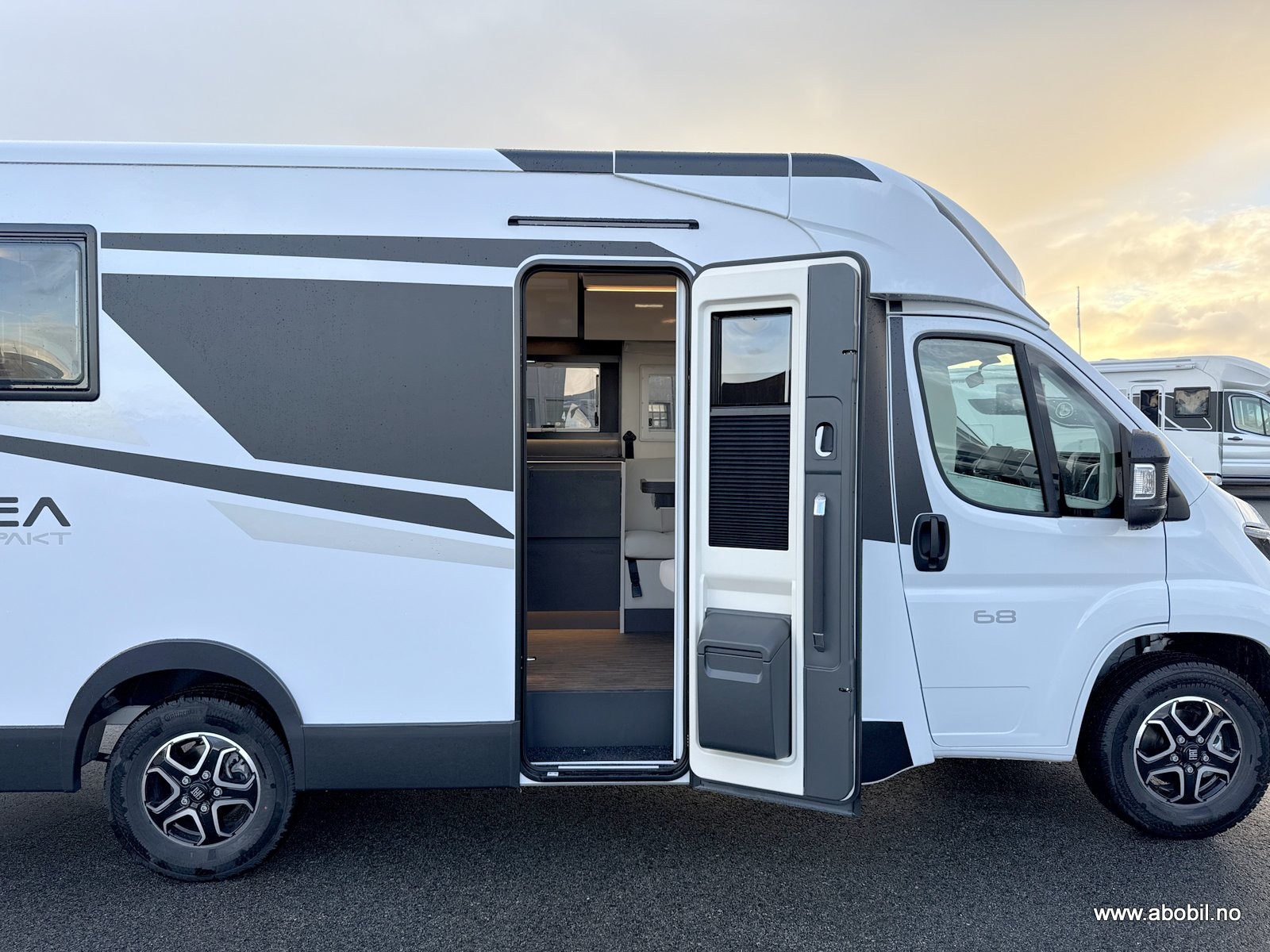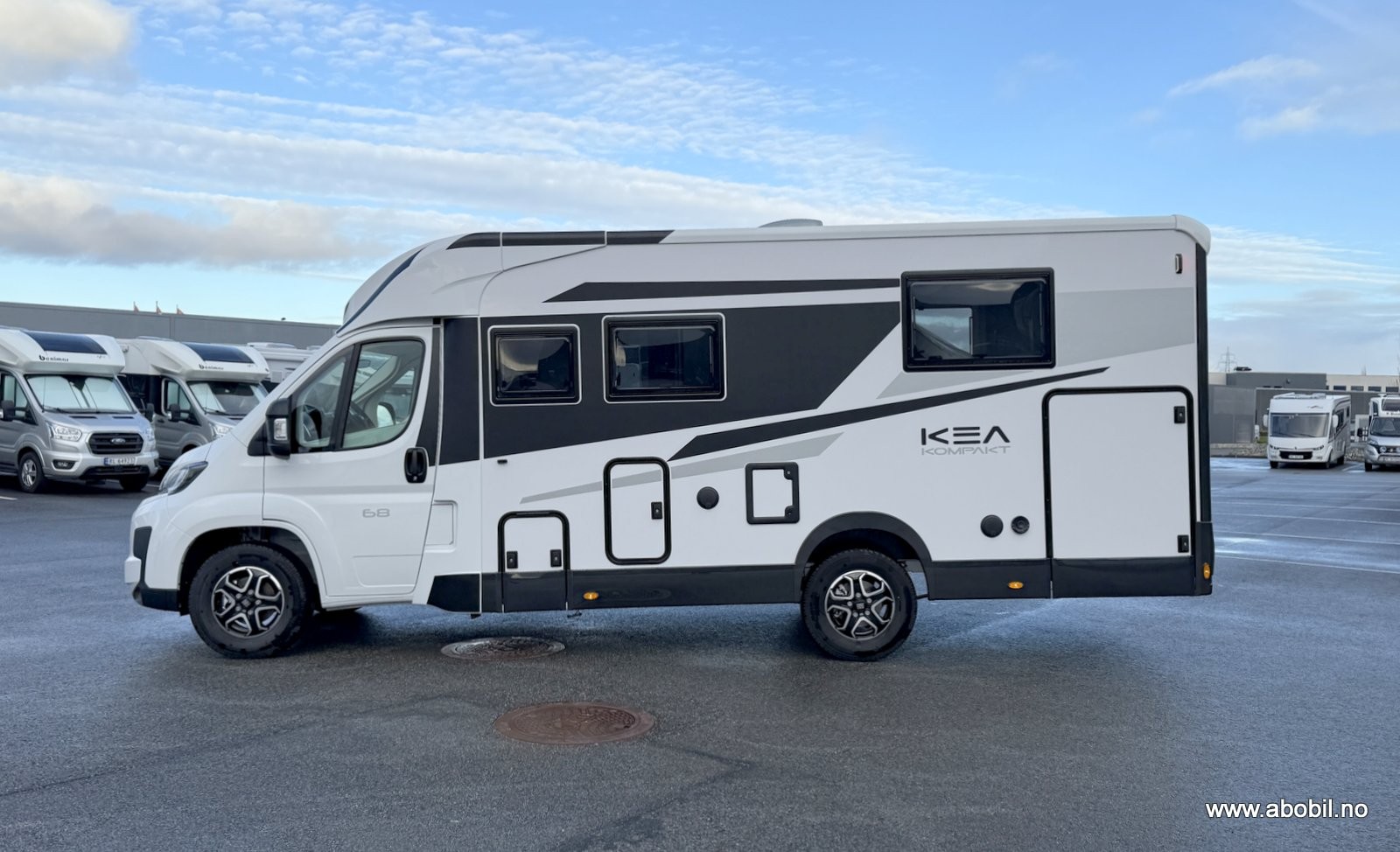 Vi har fått en stilig KEA kompakt 68 på lager. En kompakt del-integrert bobil med romslig oppholdsrom med face-to-face sittegruppe, tverrstilt baderom med separat dusj, og en midtstilt seng med skyvbar og høydejusterbar sengebunn.