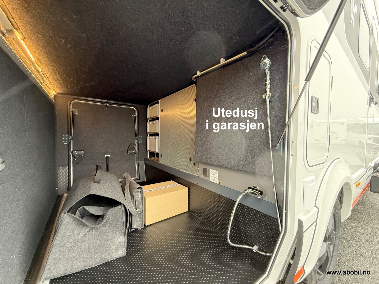 Utvendig komfort – 5,0 m markise med LED-lys, utvendig dusj i garasje, uttrekkbar lastekasse på passasjersiden og hyllesystem i garasje.