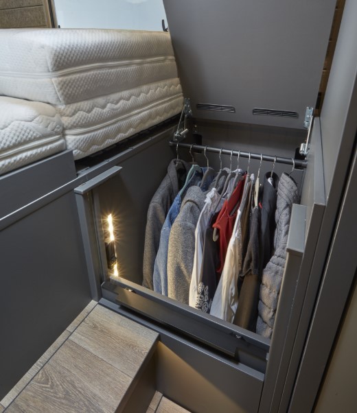 Fullt utstyrt kjøkken – Premium kjøkken med forlengbar benkeplate, smart plassering av kompressorkjøleskap (138 L) med fryseboks. Elektrisk kjøkkenhylle hvor du kan oppbevare det du trenger. Genialt at den kan senkes ned og bort etter kokkeleringen.